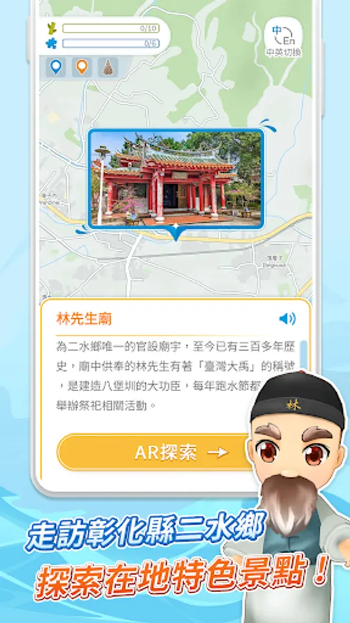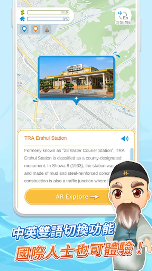 The "Augmented Reality AR Bilingual Guide APP for Ershui International Water Running Festival" introduces augmented reality AR technology, connects local cultural attractions, puzzles, etc., and combines Chinese and English bilingual interface switching functions, allowing More international people know about Ershui and Water Running Festival activities, enhancing the connotation of sightseeing and historical inheritance.