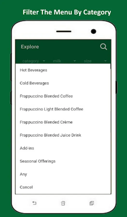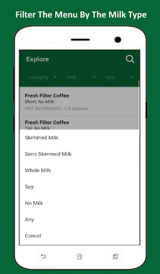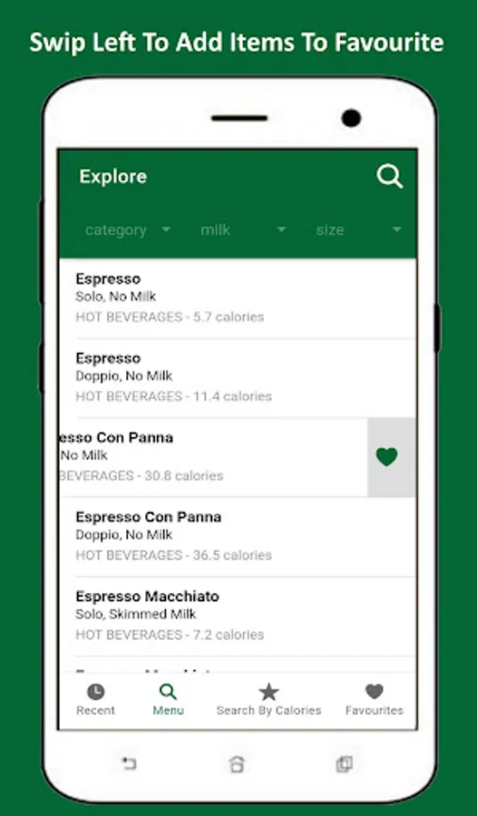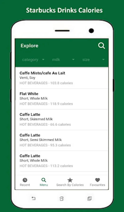You can filter the Starbucks menu with a calories limit to view all the drink available that you can order within your calories intake. Also you can filter the menu with specific size, type or milk to choose what to order faster with the top bar.