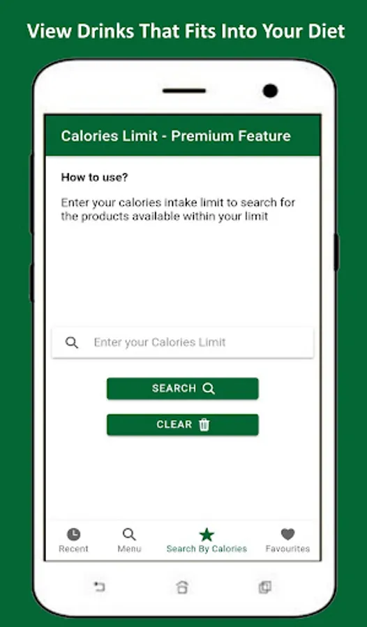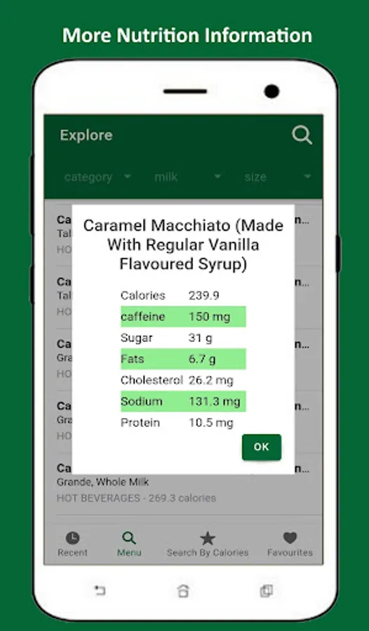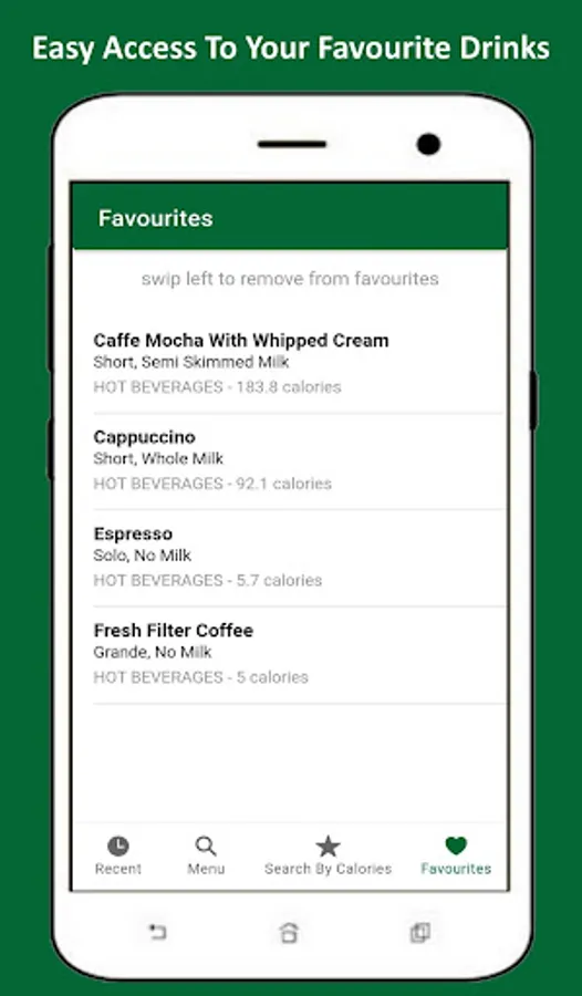 You can view all the nutrition facts and calories of a drink by clicking on it. You can view the recent drinks that you lately view for easy access