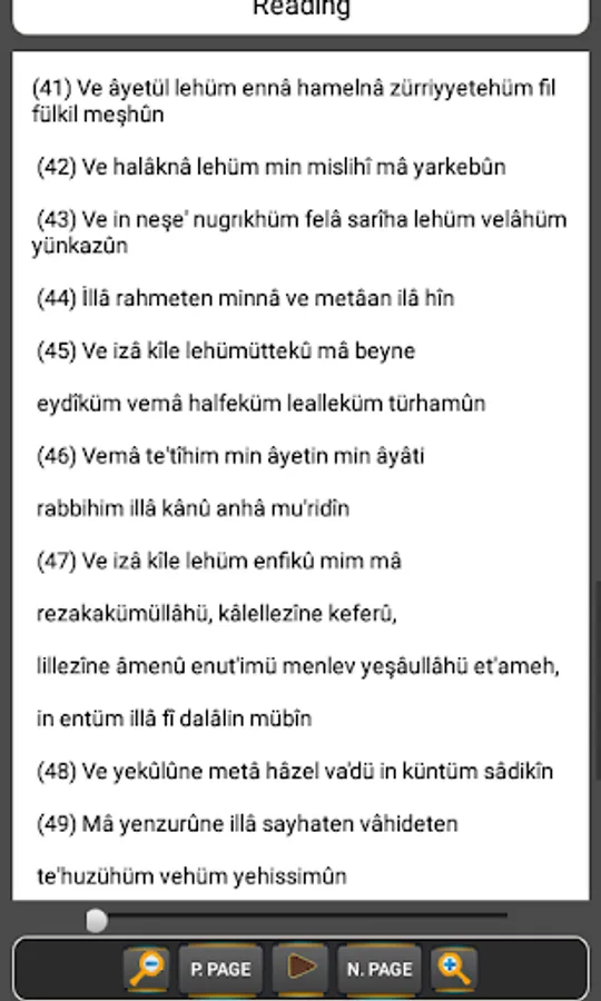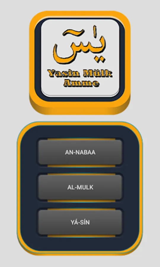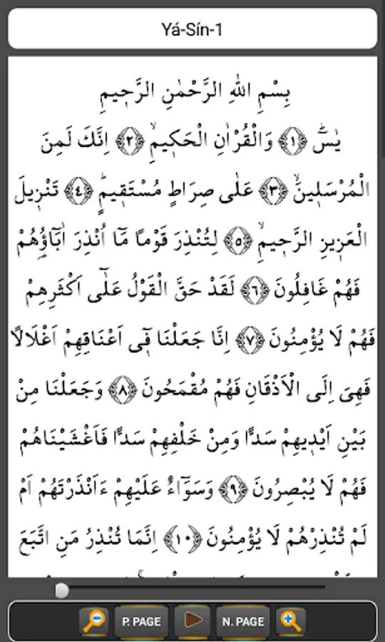 Yá-Sín, Al-Mulk, and An-Nabaa. You can listen these Surahs in our application. And you can read with Arabic and you can read their meaning. You can zoom in and zoom out with buttons. You can forward and backward with bar to sounds. So, this application for you.