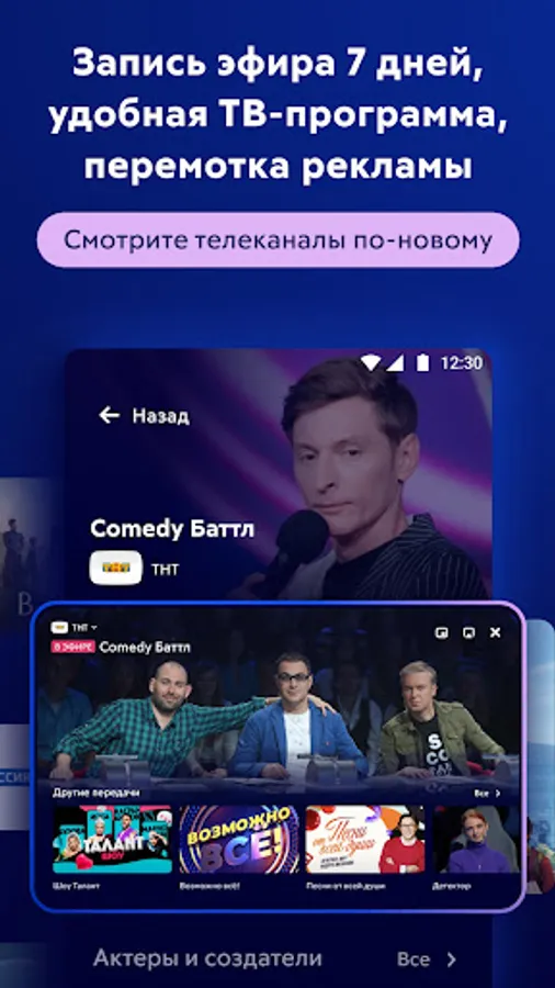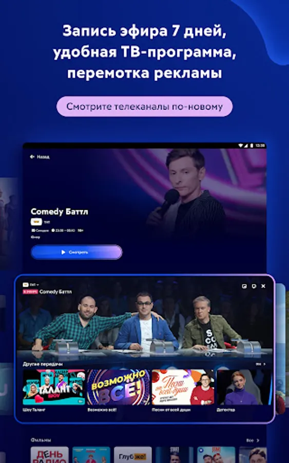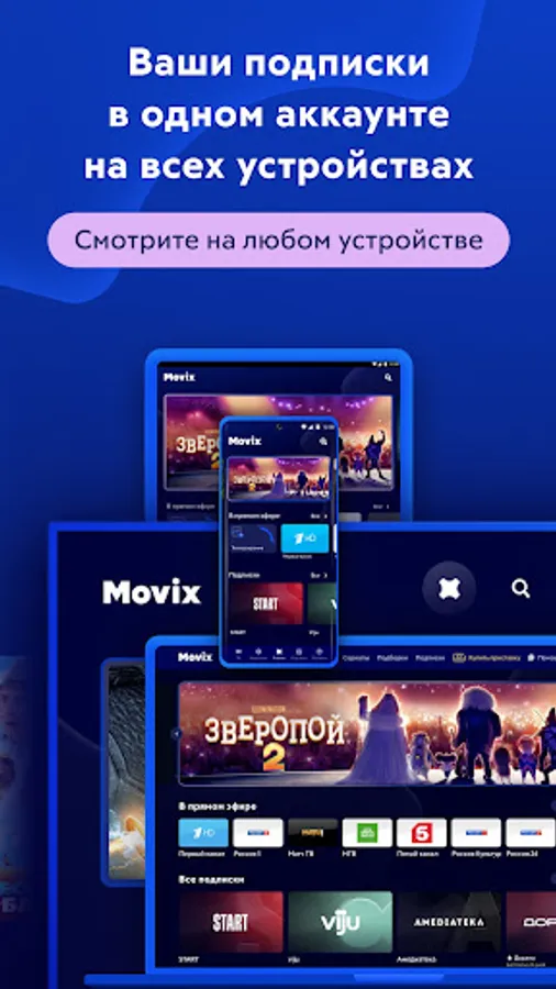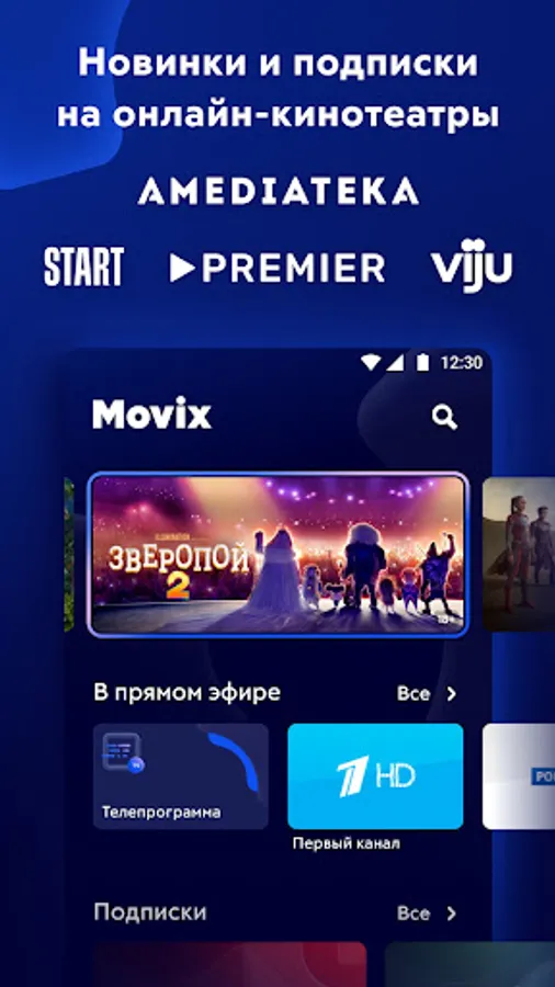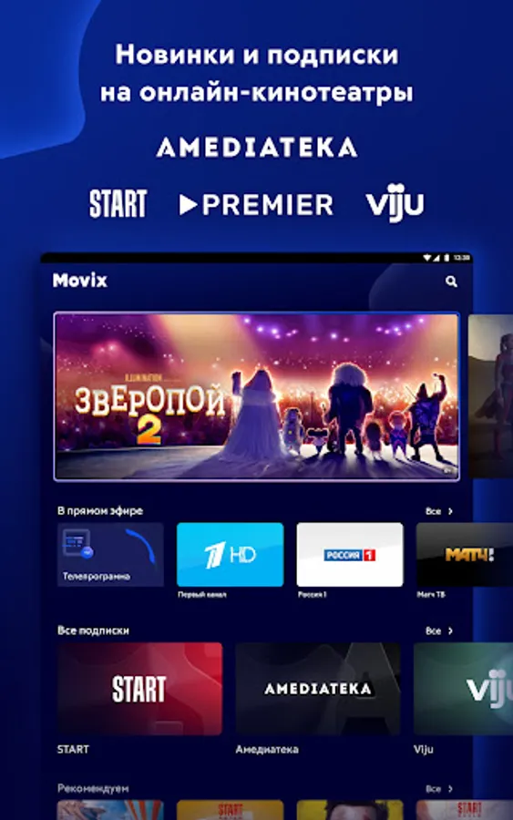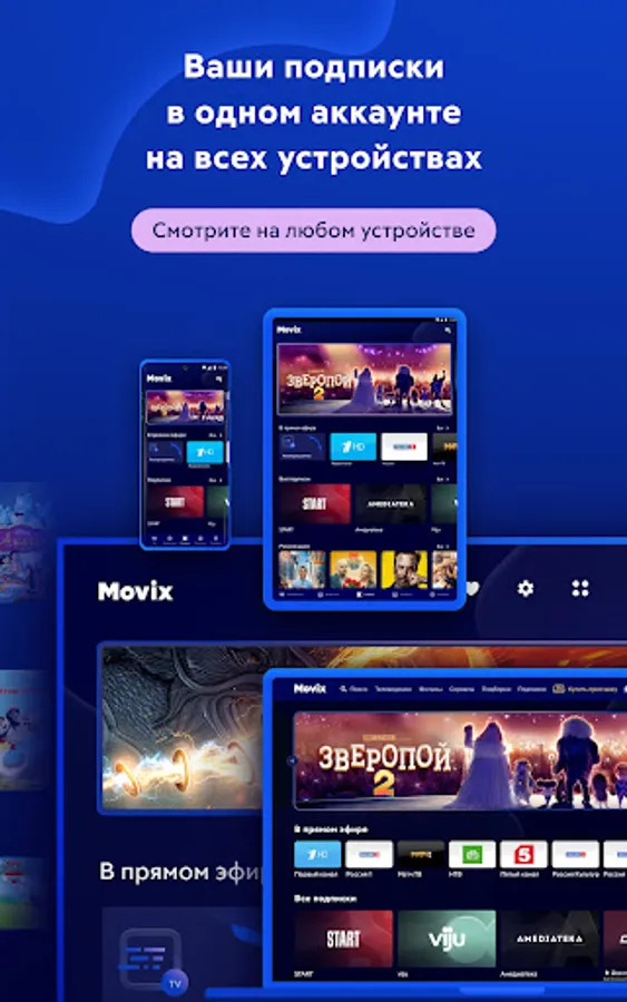 TV channels, movies from popular online cinemas Premier, Amediateka, Start, Viju and much more. Anytime, anywhere!