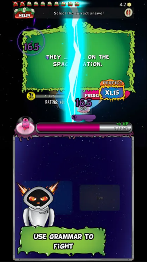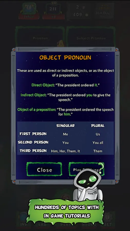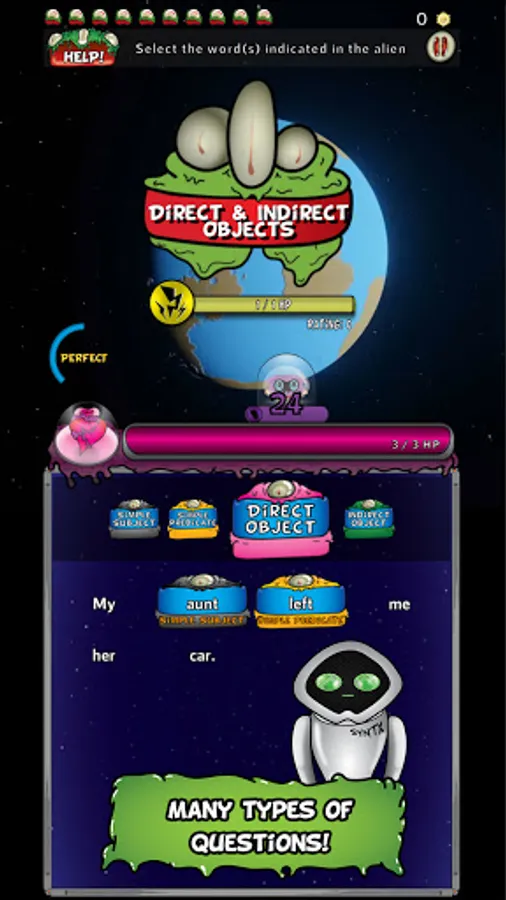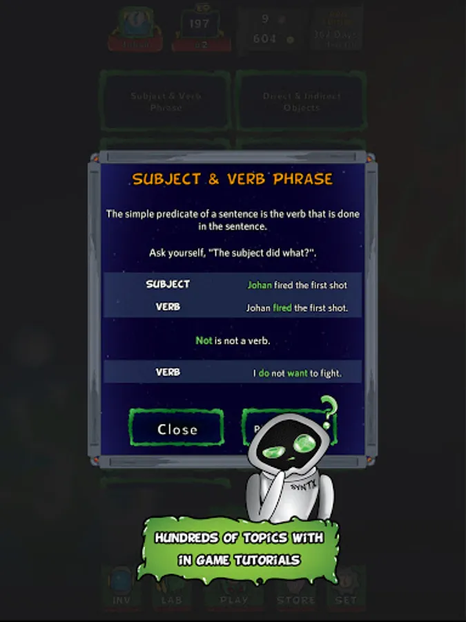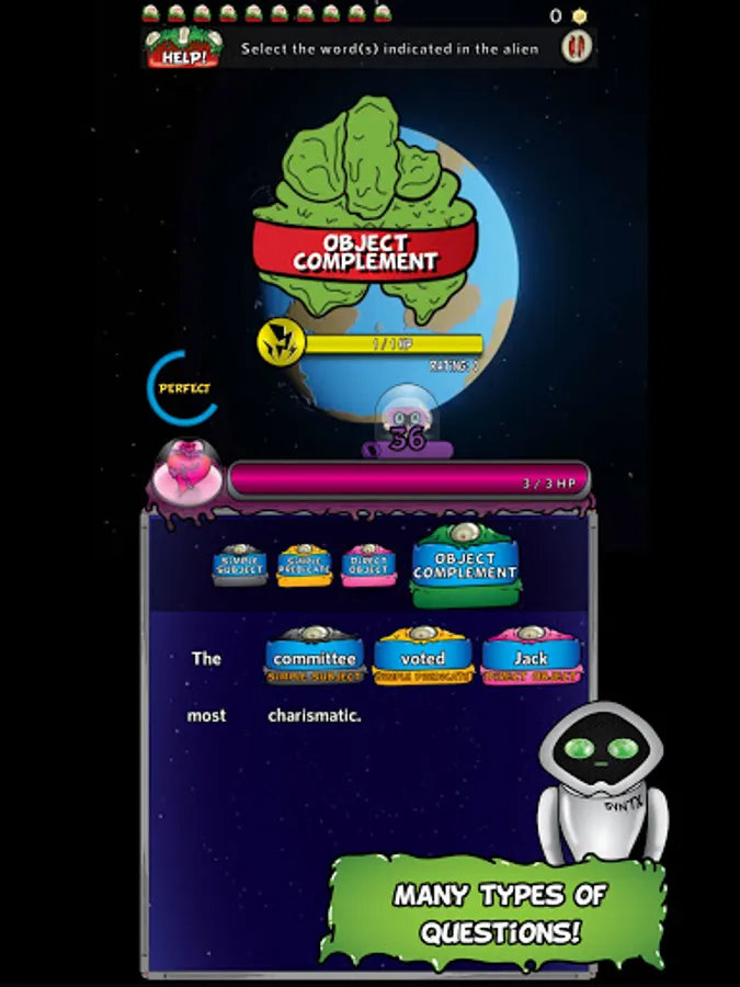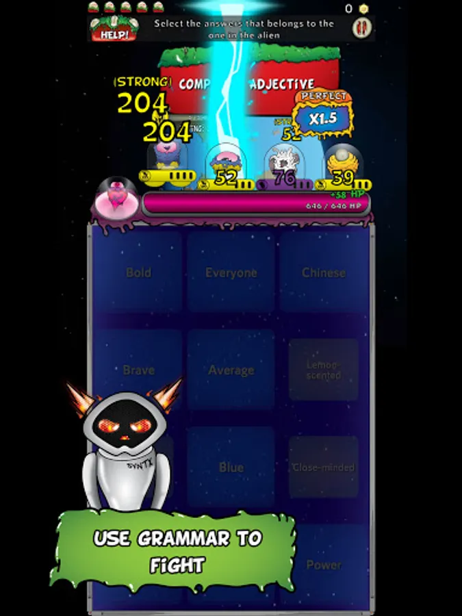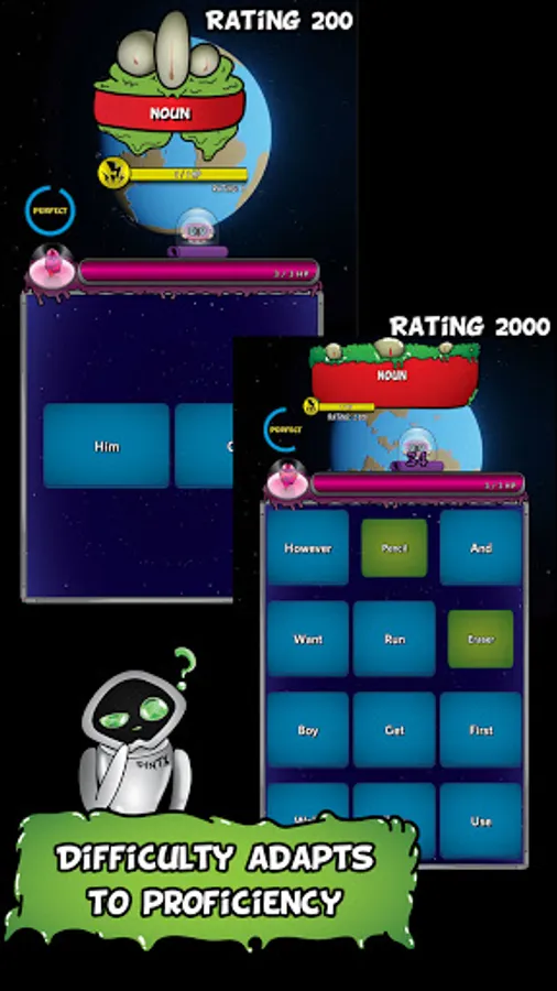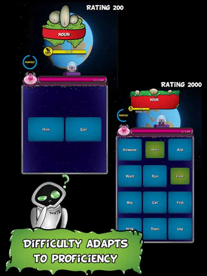 Grammar Alien is the game to learn English grammar. Use a team of monsters to fight the evil aliens using grammar. It features incredible graphics and animations in a space theme. It contains over 100 different types of quizzes. The app will track your progress and adapt to your level.