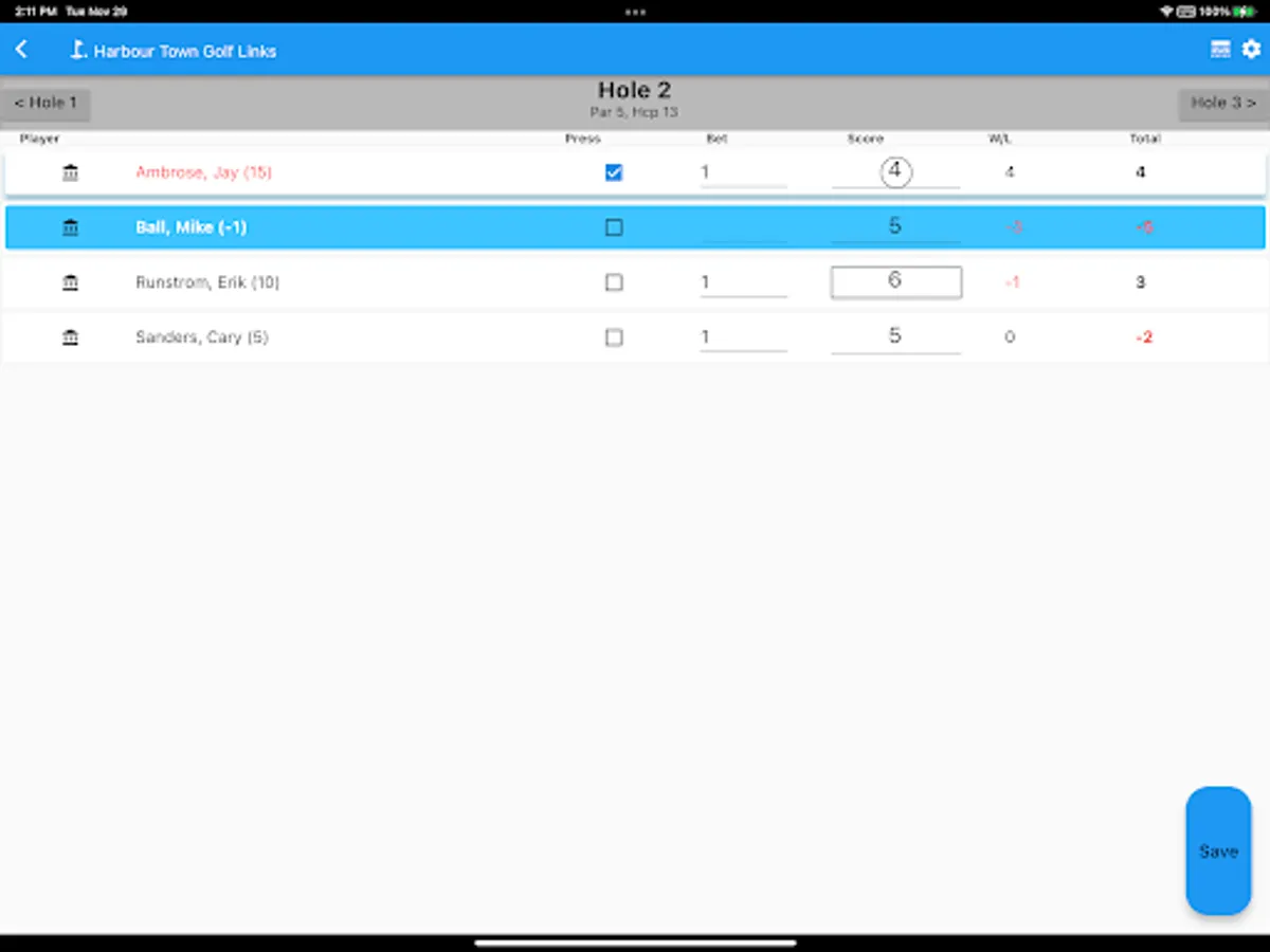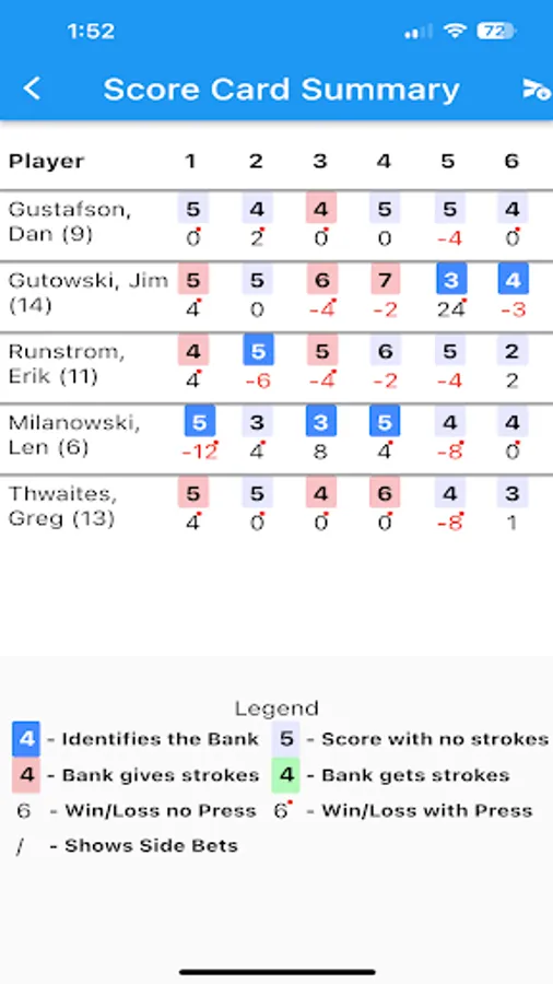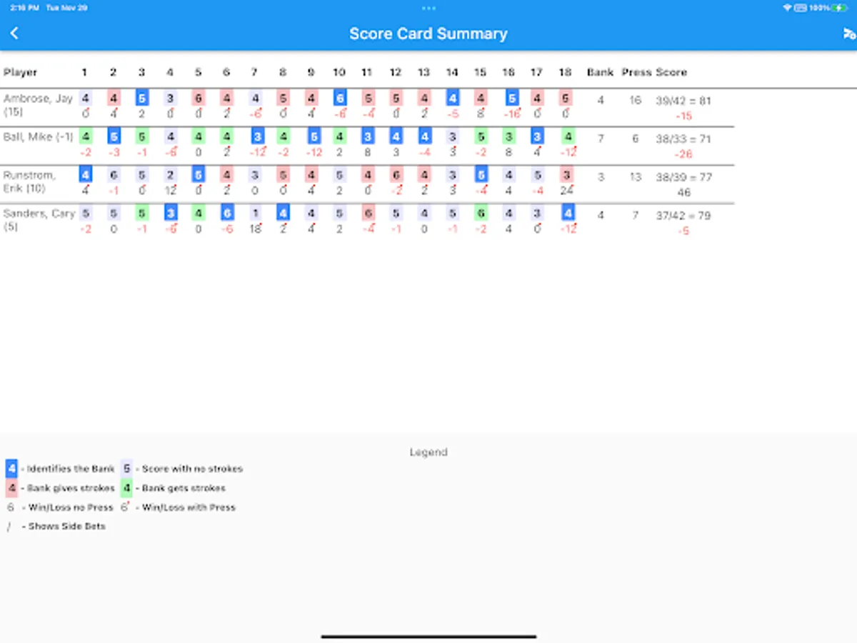 While the concept of the game is relatively simple, there are multiple complications when scoring all the different bets and handicap adjustments. Thus the reason for the Golf Bank App. The Bank App keeps track of all the bets, scores, presses, and handicap allowances to provide a simple interface to score the results, enjoy the game and rub the losses in your buddies faces.