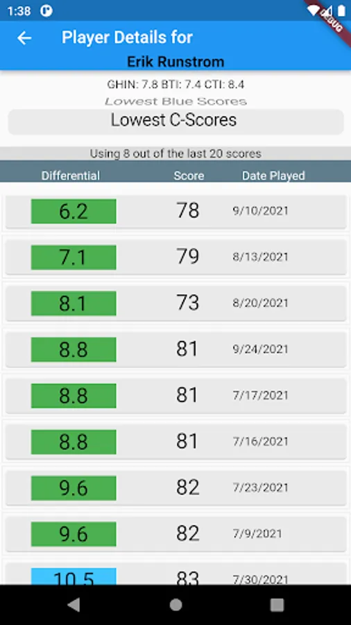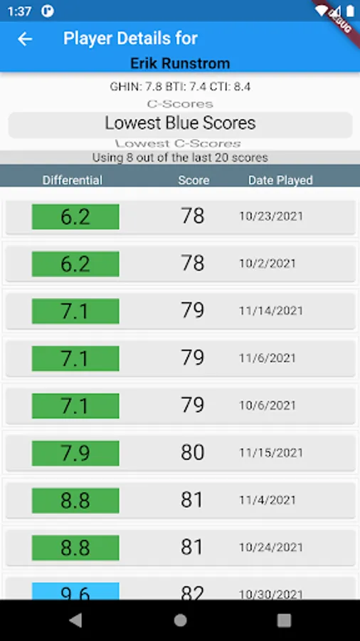 After logging in to the App, the players PCH will be shown, indicating which criterium was used to create the value. Members may view all their scores that were used to compute their BTI and CTI values. The App will also allow players to look up the PCH value for any other member of the PMGA.