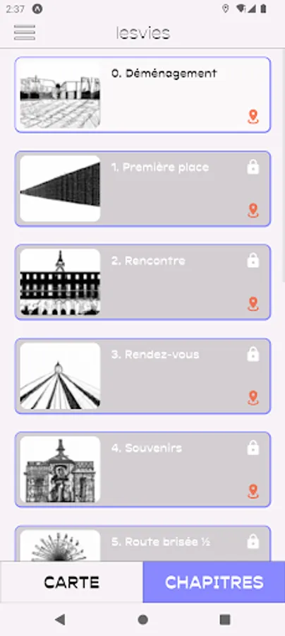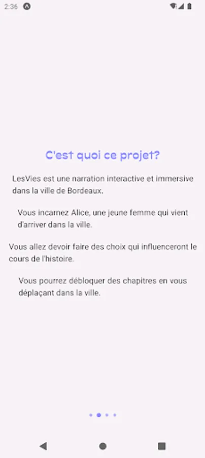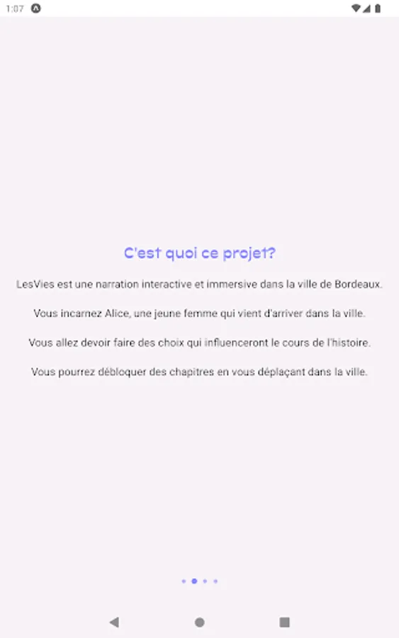 lesvies is an immersive narrative application through the streets of Bordeaux, you will have to go to where the chapters take place in order to follow Alice's story.