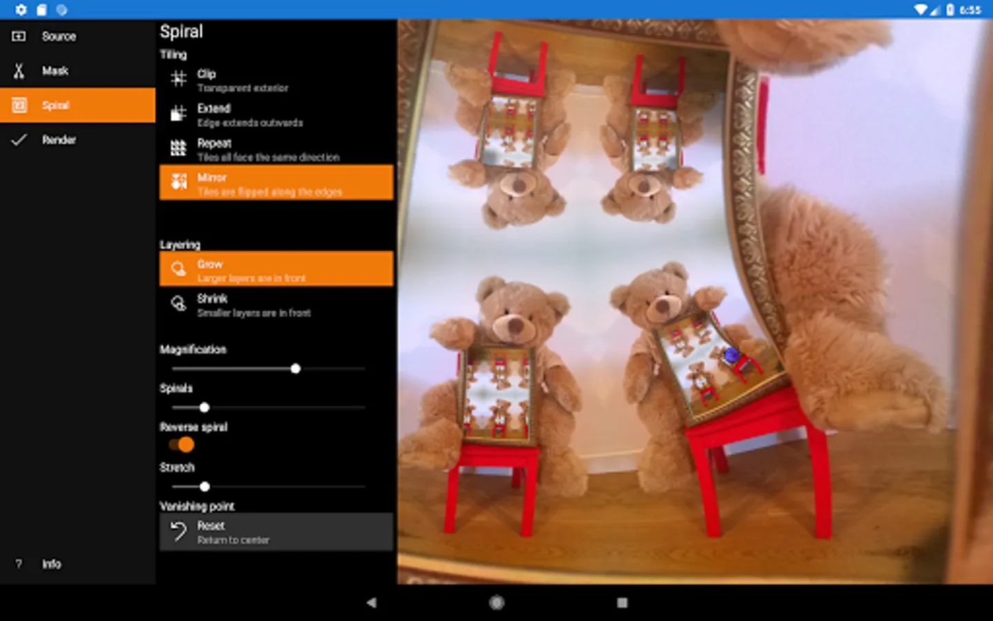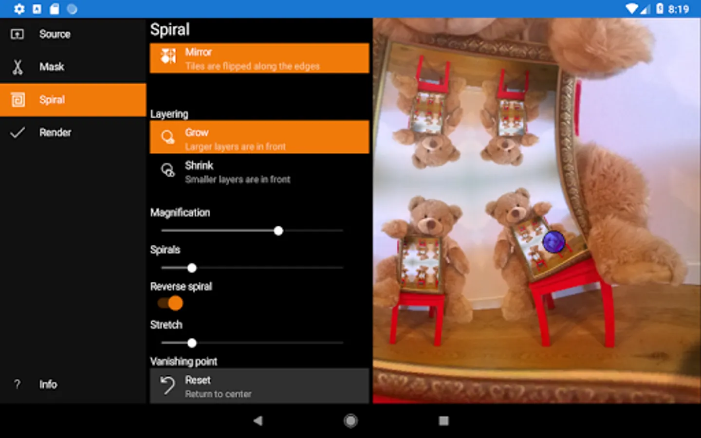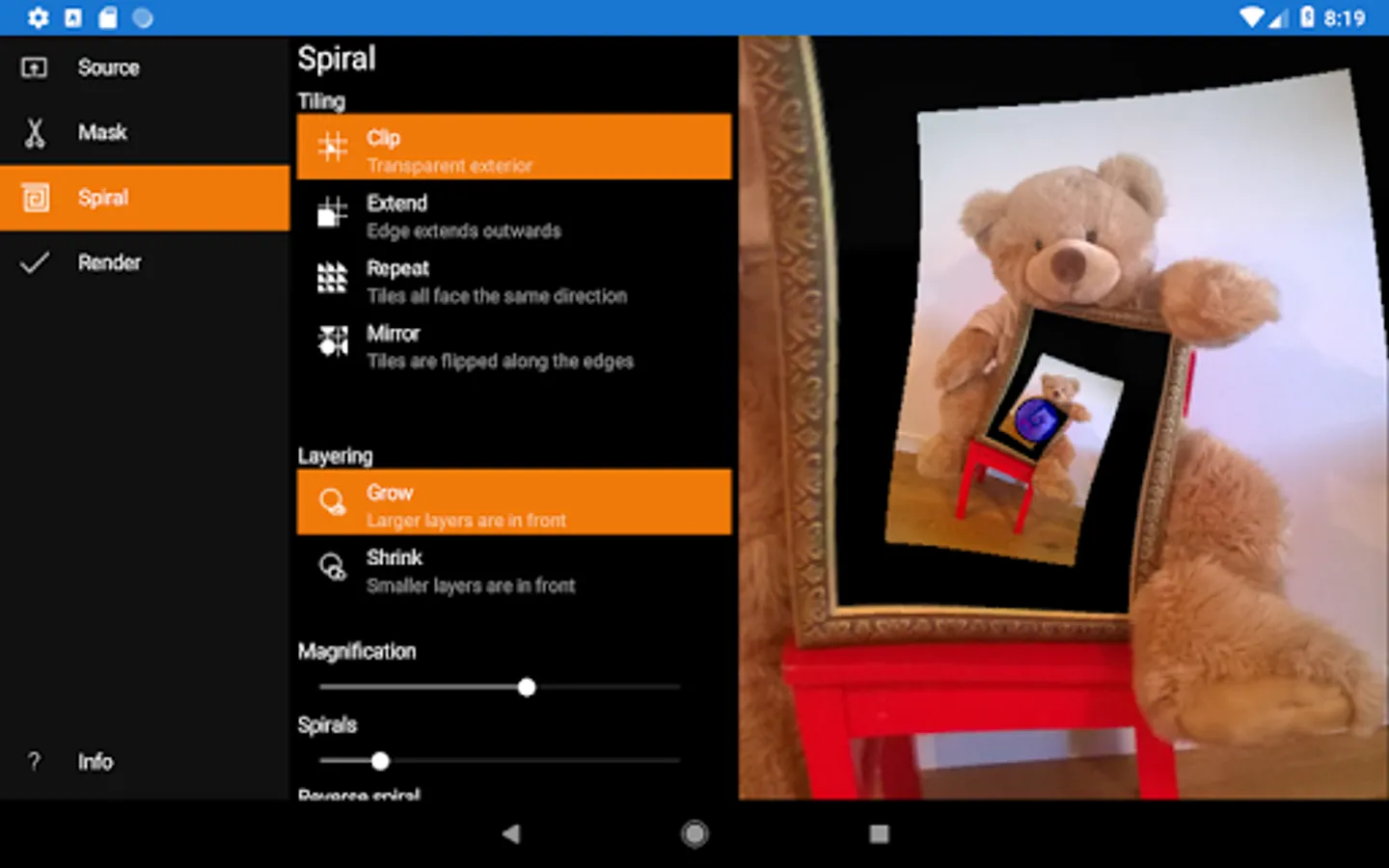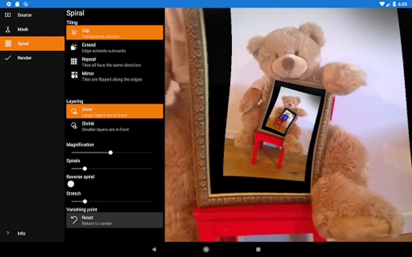 Transform your pictures into Escher-like works of art! Apply the Droste Effect to any picture with this easy to use app. Use images with transparent backgrounds, or apply your own mask inside the app. Interactively change the properties of the effect and instantly see the result!