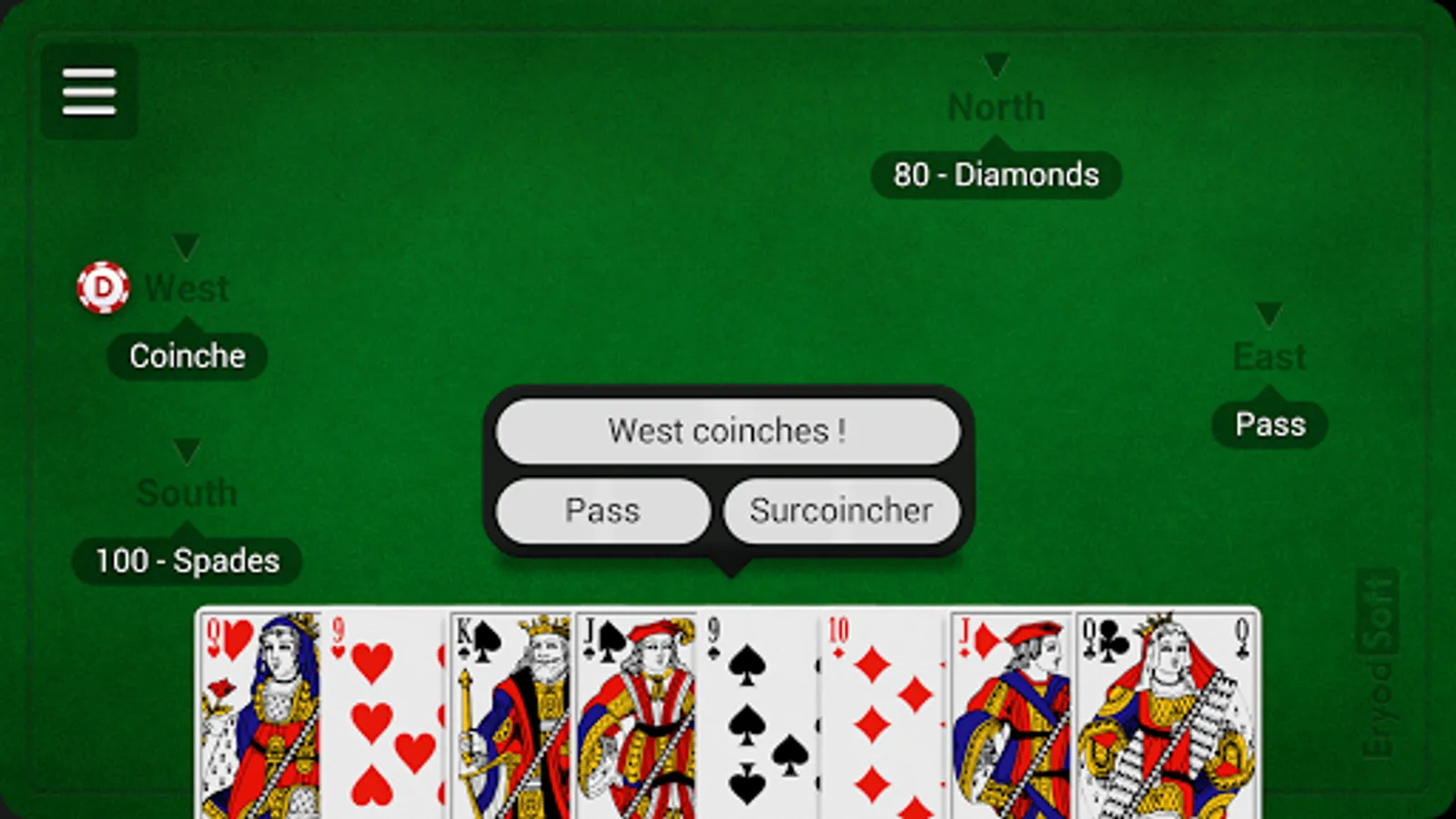 Play to the popular French Coinche card game, also named Belote Contree on Belote Coinchee against opponents simulated by an high-level artificial intelligence.
