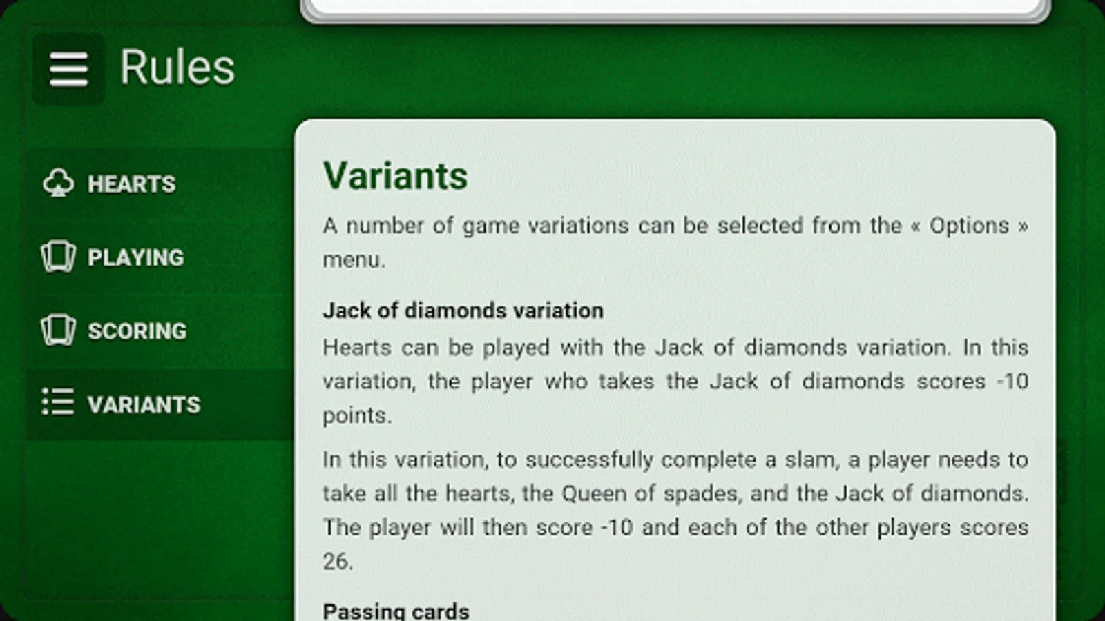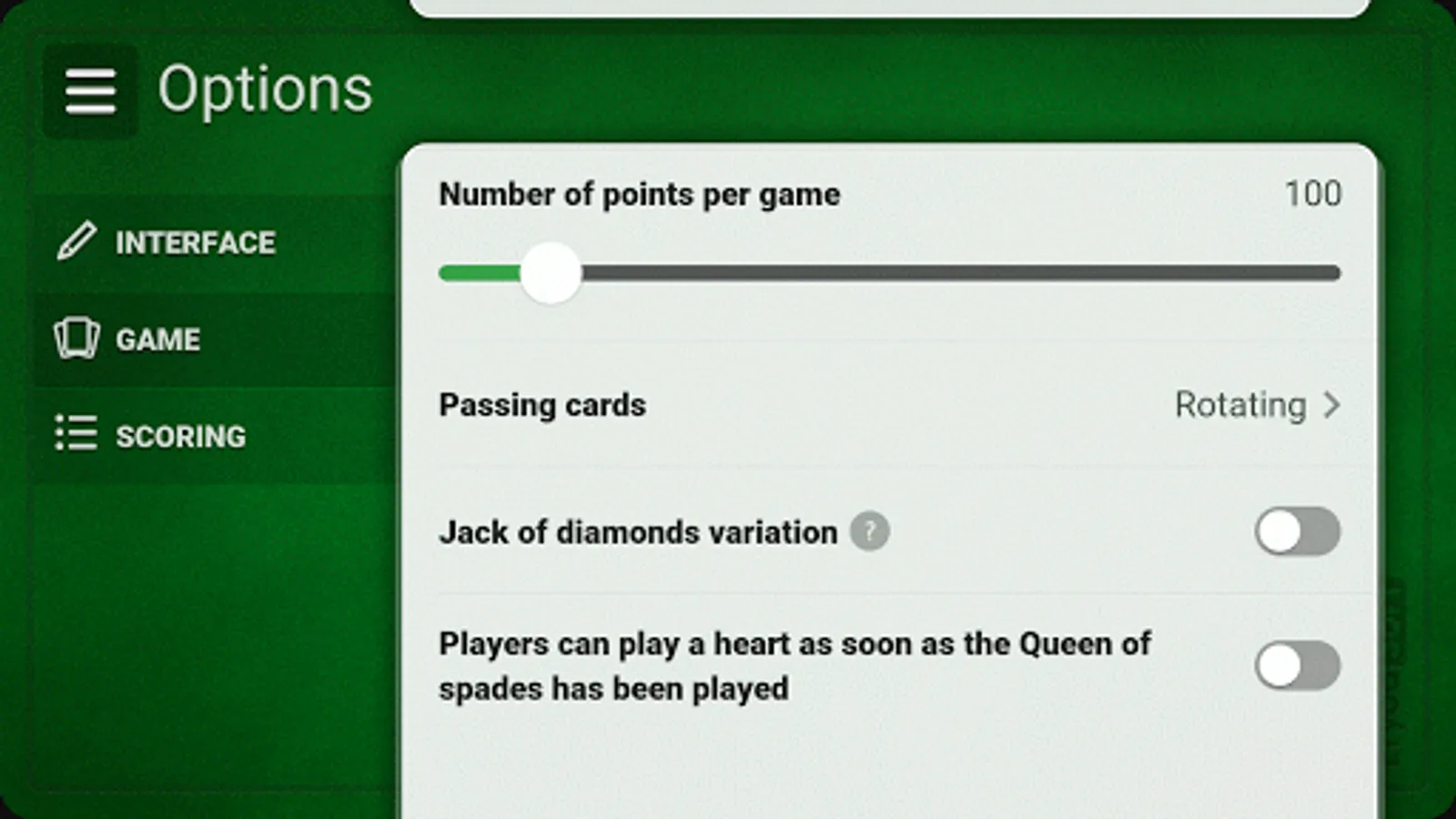 Play the famous game of Hearts against opponents simulated by advanced artificial intelligence.