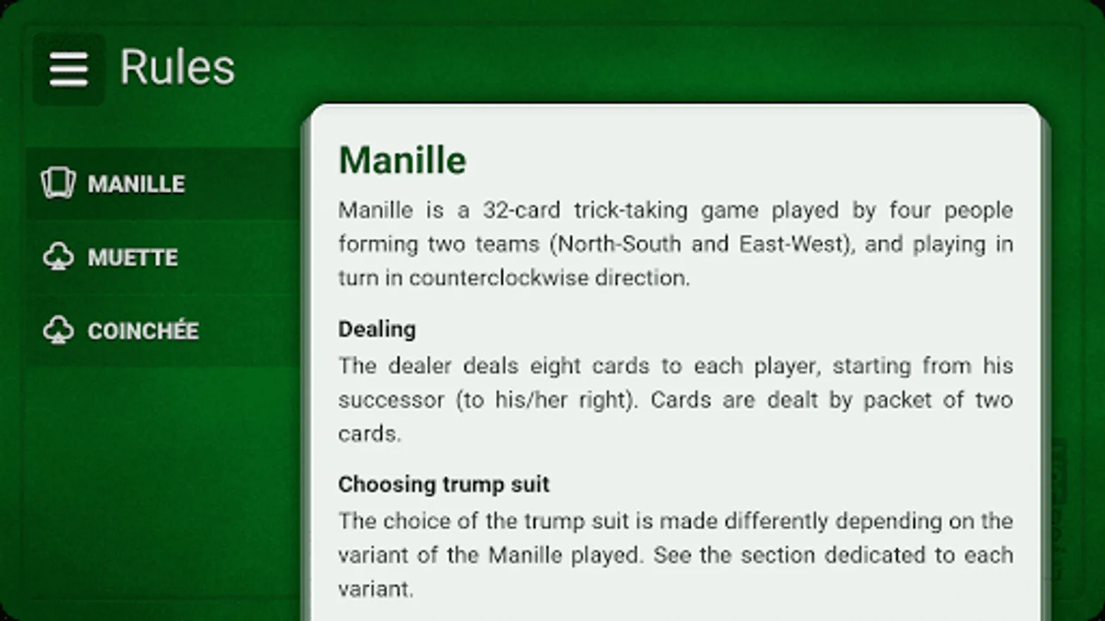Play to the popular Manille card game, against opponents simulated by an high-level artificial intelligence.