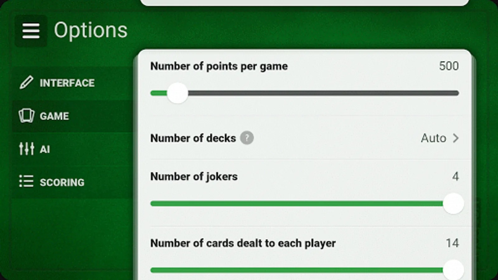 - Number of cards dealt to each player (from 7 to 14).