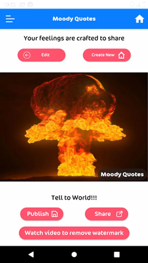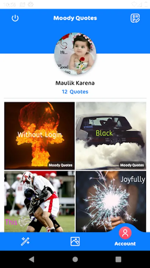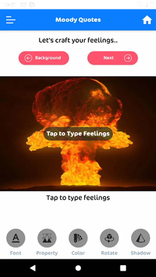 Moody Quotes Creator is the best way to create and share your quotes with the world. Quotes Creator allows you to customize the background, text colors, text size, and fonts. So you can share your own moods and feelings with your friends.