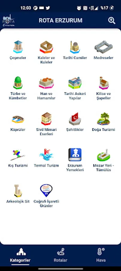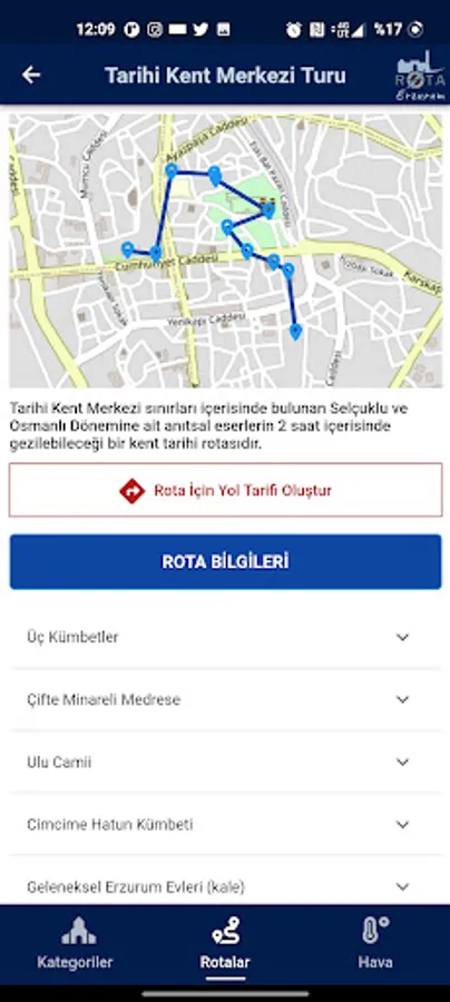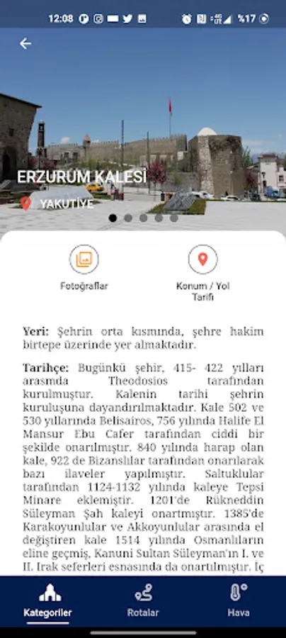 It is a digital platform where detailed information about the cultural heritage in Erzurum is obtained. With this application, it provides a service that provides access to the locations of Historical Buildings, Protected Areas, Recreation Areas, Nature and Thermal Tourism centers in Erzurum and provides detailed information about Gastronomy Culture. In order for you to get to know our city in more detail with all its aspects, it enables you to make an efficient and accurate trip through navigation by choosing suitable routes over the appropriate travel routes. In addition, by filtering on the features and architectural qualities of the historical monuments you will visit from your location (Madrasa, Mosque, Fountain, Inn, etc.), you can determine the most appropriate route to the structures in the group you specify, and you can make an efficient trip in a shorter time.
