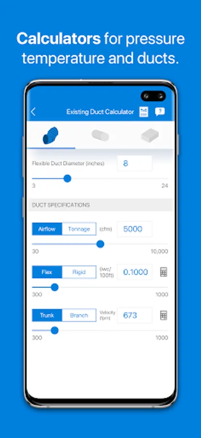 * access multiple useful calculators, including the PT calculator, Sub-Cool calculator, Superheat calculator, Existing Duct calculator, and New Duct calculator