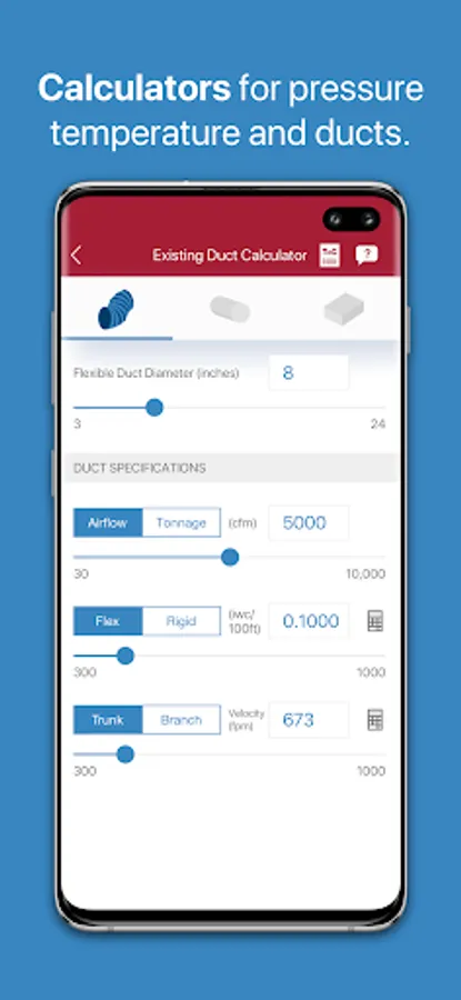 * access multiple useful calculators, including the PT calculator, Sub-Cool calculator, Superheat calculator, Existing Duct calculator, and New Duct calculator