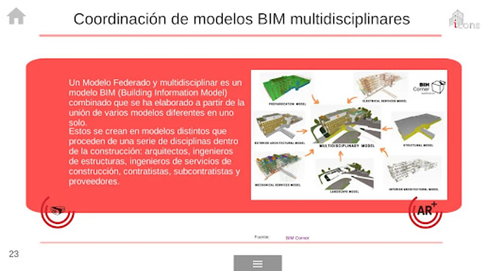 Innovation in CONstruction Sites (ICONS) allows the BIM model to be brought closer to professionals in the construction sector. Throughout the application, the most important aspects of this model are presented through the use of interactive tools such as the use of videos, images and exercises. It also allows the study of structures through its 3D models and augmented reality.