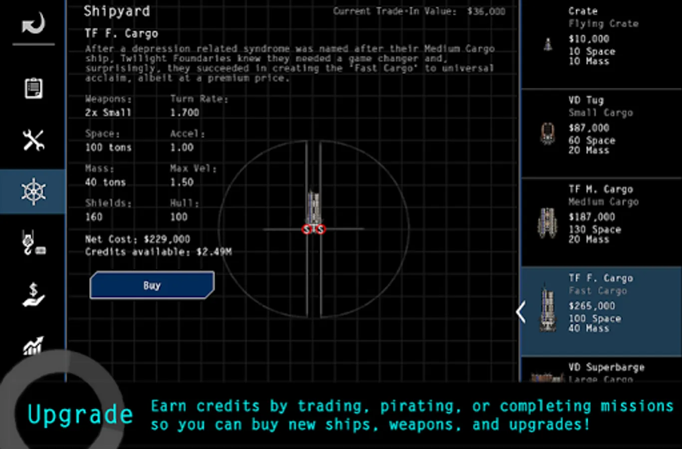 - Want to make more credits? Try trading! Each planet sells commodities at different prices, figure out the best trade routes and work your way up to ships that can hold a lot of cargo!