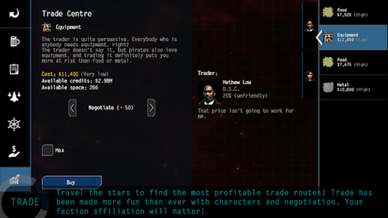 - Want to make more credits? Try trading! Each planet sells commodities at different prices, figure out the best trade routes and work your way up to ships that can hold a lot of cargo!