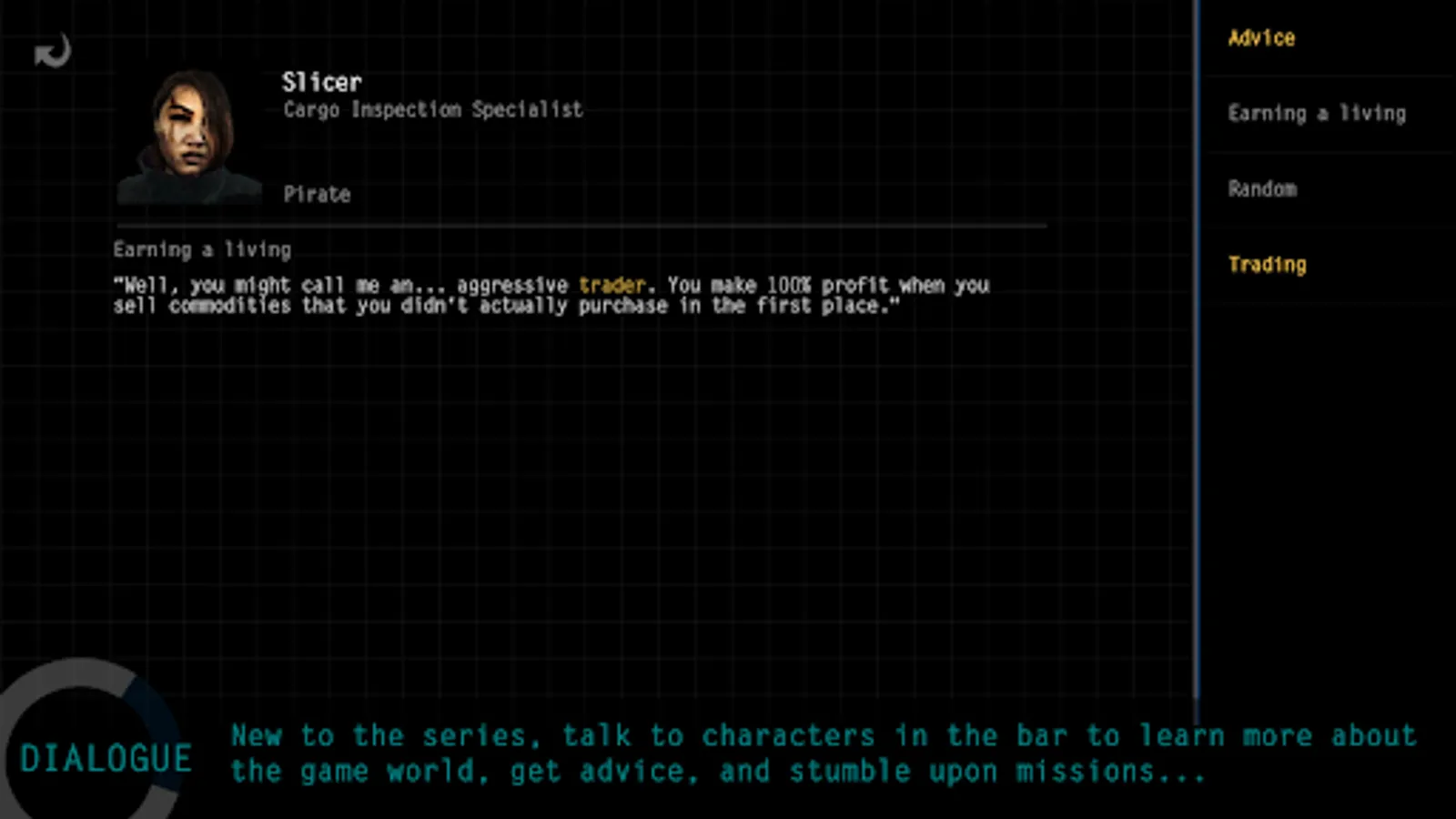 - THE BAR! How did we ever get by without it - stop by at the spaceport and talk to characters to get advice, learn more about the world, or progress a current objective.