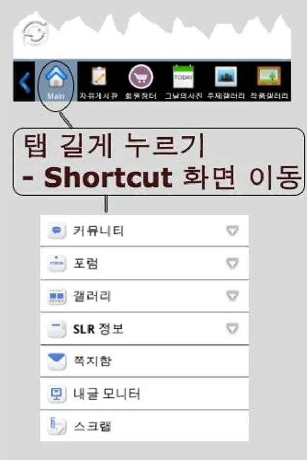 - Each tab 'press and hold' Shortcut on each menu, you can move easily through the screen is