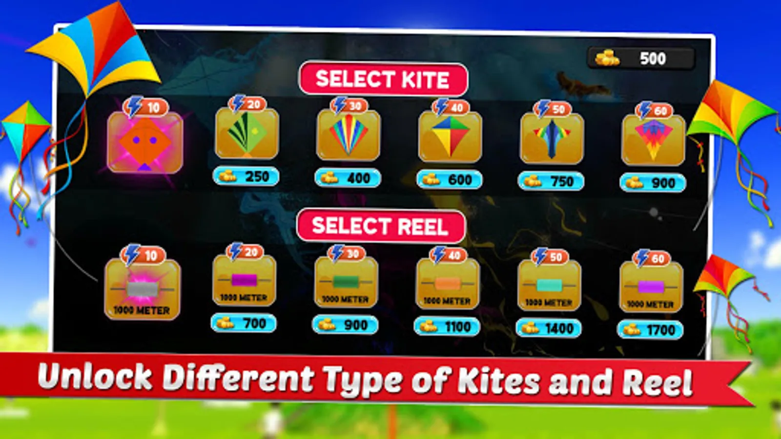 - Get Points while cut opponent kites, use points to purchase or update kites and reels.
