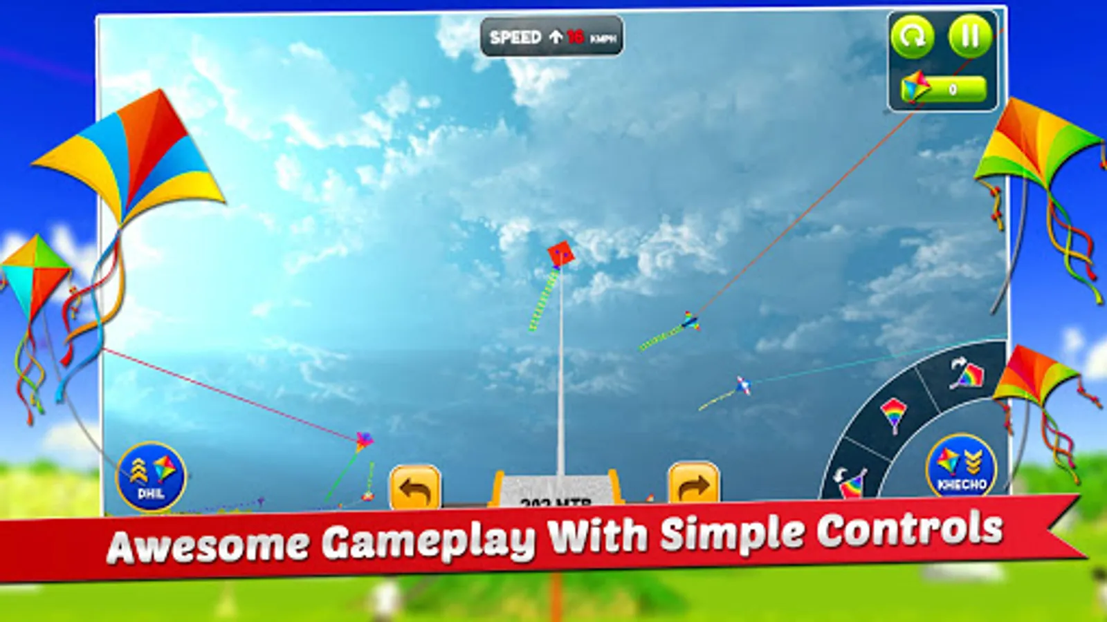 Show your "Khech", "Dhil" and "Thumka" skills of kite flying. All controls are too much realistic that you will feel real kite flying on your terrace.