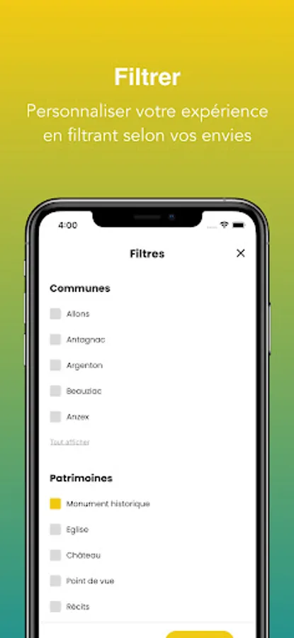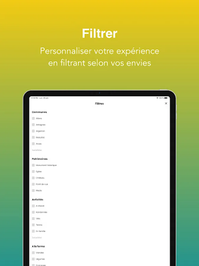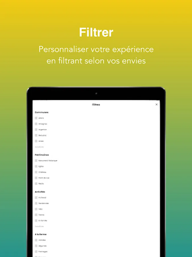 Add filters according to your desires: well-being, heritage, sport, walks... There is something for everyone.