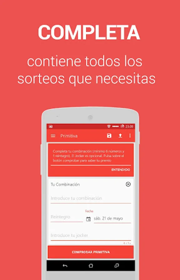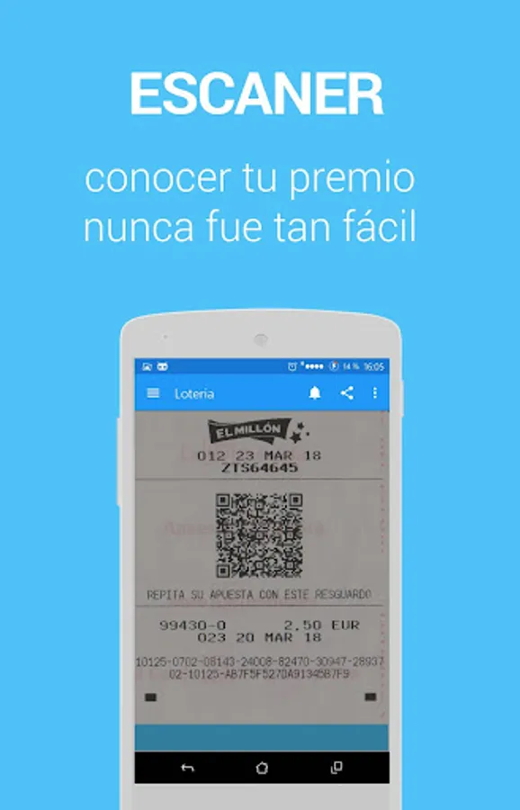 Lottery and Betting Scanner allows you to check the results and winning numbers of all Lottery draws. The application incorporates a QR barcode reader so you can know if your Loteria tickets (Bonoloto, Primitiva, La Quiniela, Euromillion, National Lottery or Gordo de la Primitiva) are awarded quickly and very intuitively. This function is available for all weekly draws as well as other special draws such as the Christmas Extra or Child Draw.
