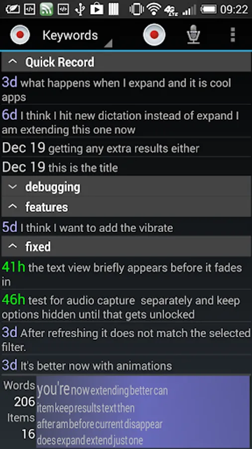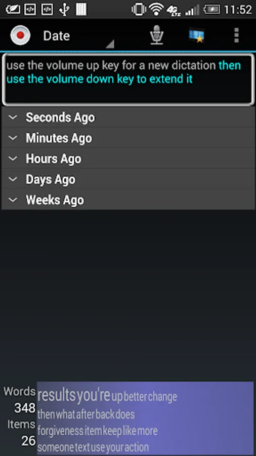 The Main Screen shows your Dictations grouped and sorted by Time stamp, Title, or Keywords.