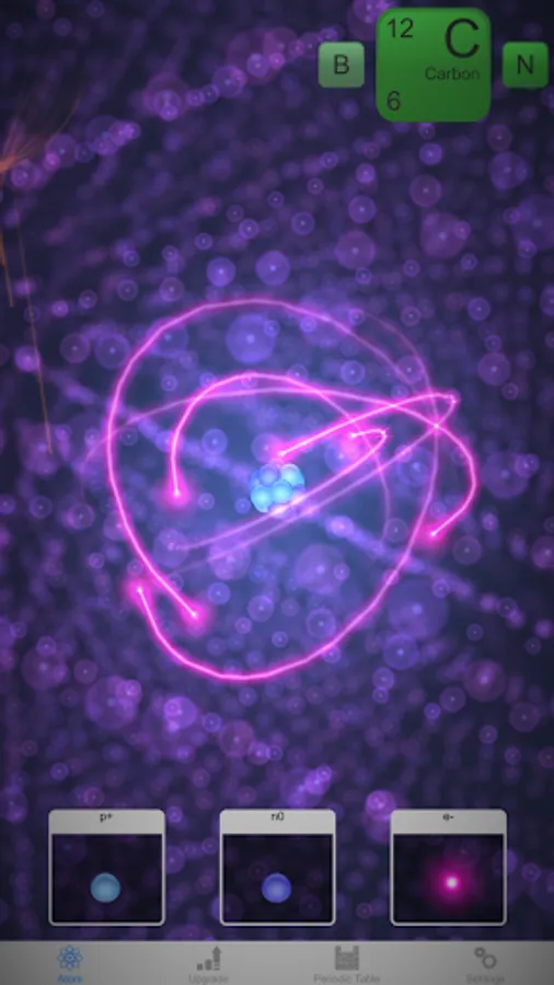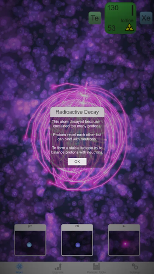 Nuclear is a high tech educational application that dynamically models an interactive atom in a beautiful and intuitive way. In Nuclear, you get to build all the elements of the periodic table via a simple mechanic of adding and subtracting the atomic building blocks of neutrons, protons and electrons. The goal of the app is to let you learn about each of the elements of the periodic table by constructing a stable version of that element. Once a stable element has been created, it is unlocked in the periodic table. Can you create and unlock them all?