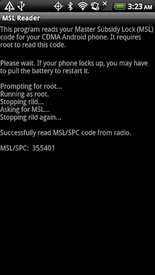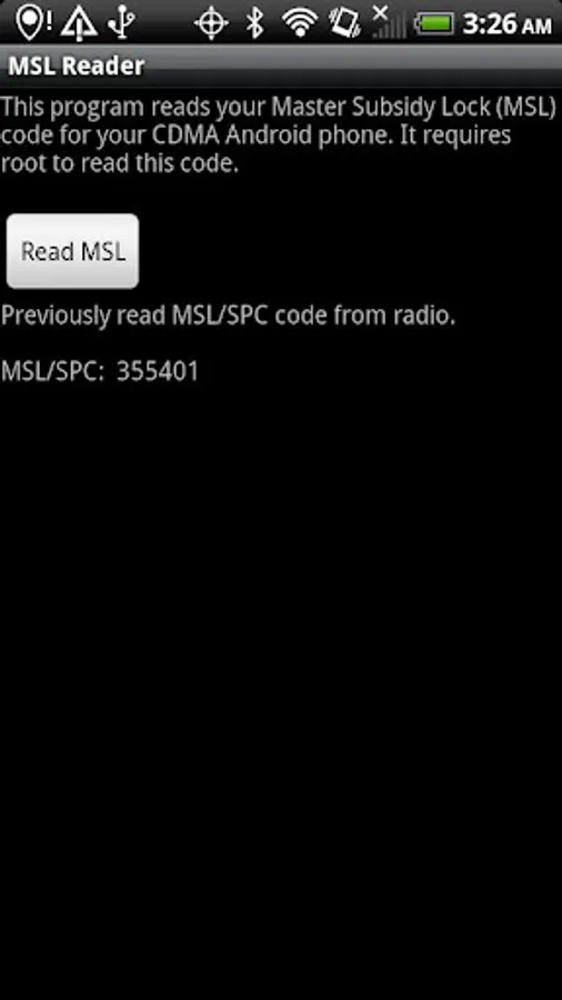This program reads your Master Subsidy Lock (MSL) code for your CDMA Android phone. It requires root to read this code.