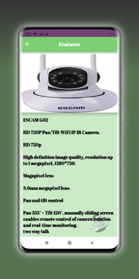 ESCAM G02 Camera The application gives you specifications and images for a camera