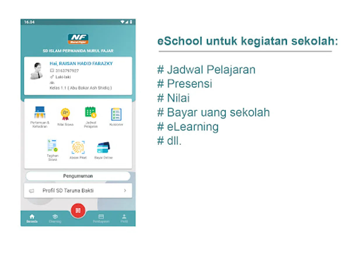 eSchool for RA schools and Perwanida Nurul Fajar Islamic Elementary Schools is an eSchool Mobile application intended for Teachers and Students of Perwanida Nurul Fajar Islamic RA Schools and Elementary Schools, Bogor. eSchool mobile includes features including:
