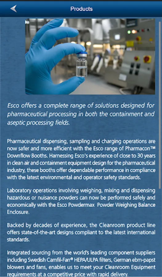 Since 1978, Esco has emerged as a leader in the development of controlled environment, laboratory and pharmaceutical equipment solutions. Products sold in more than 100 countries include biological safety cabinets, fume hoods, ductless fume hoods, laminar flow clean benches, animal containment workstations, cytotoxic cabinets, hospital pharmacy isolators, PCR cabinets, thermal cyclers and instrumentation.