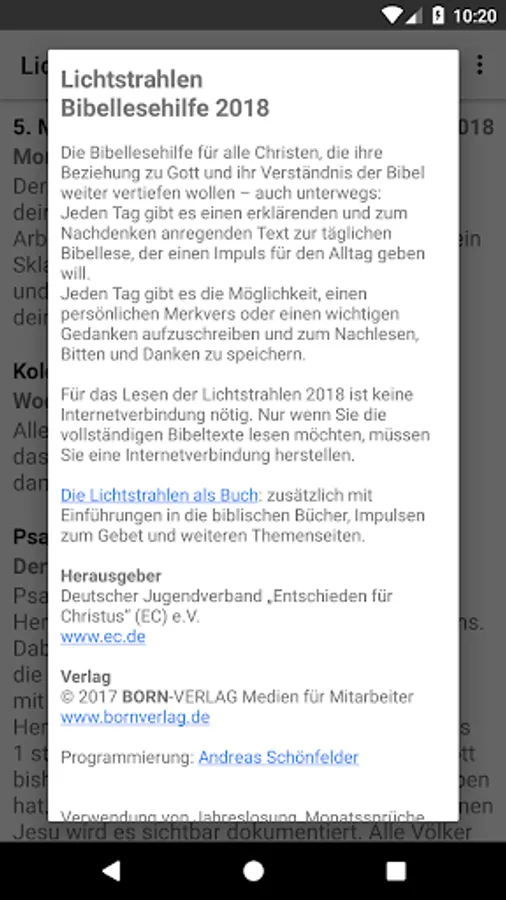 For reading the light beams 2018 Internet connection is not necessary. Only if you want to read the whole Bible texts, you must connect to the Internet.