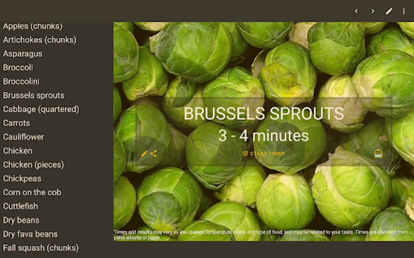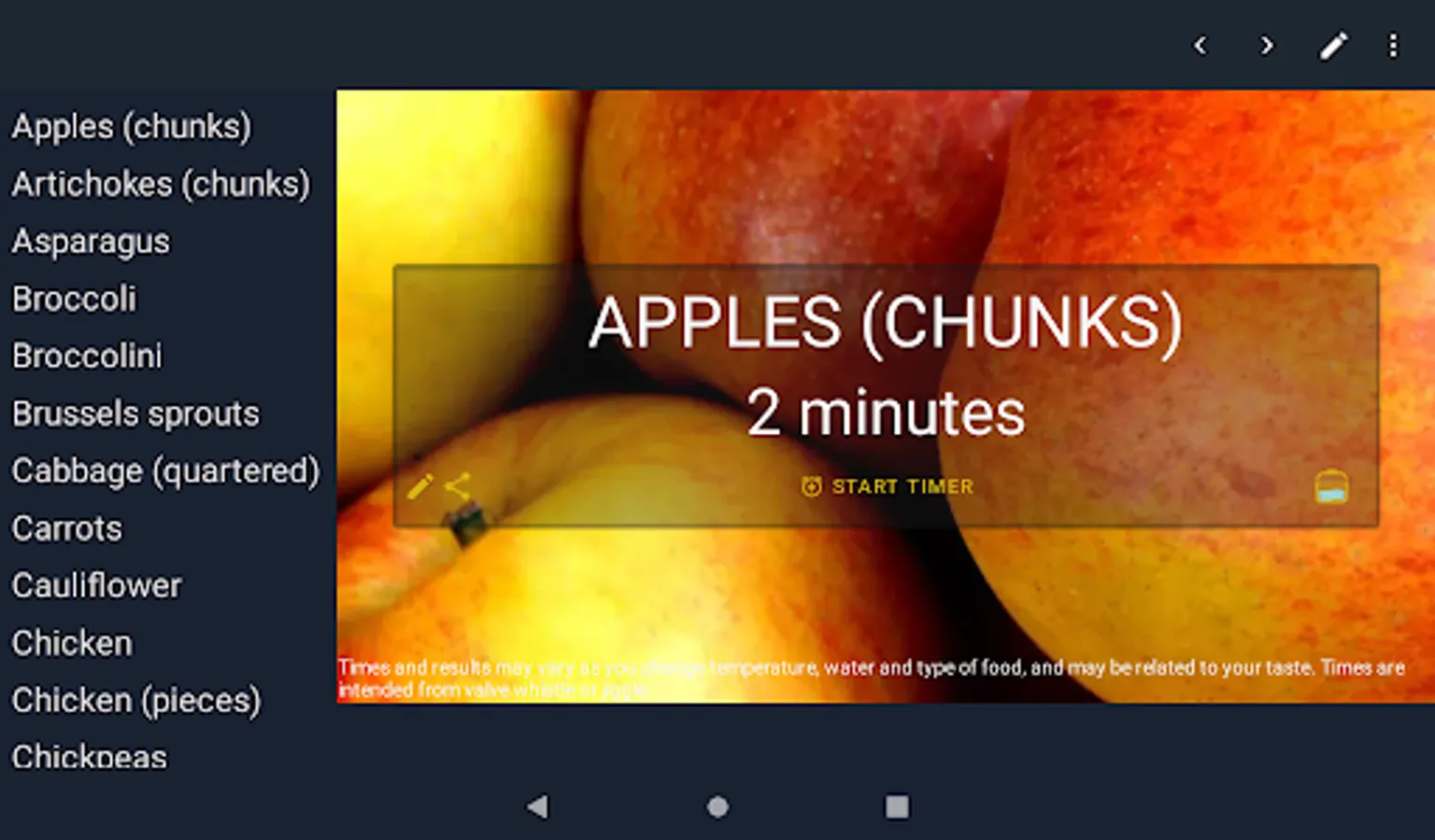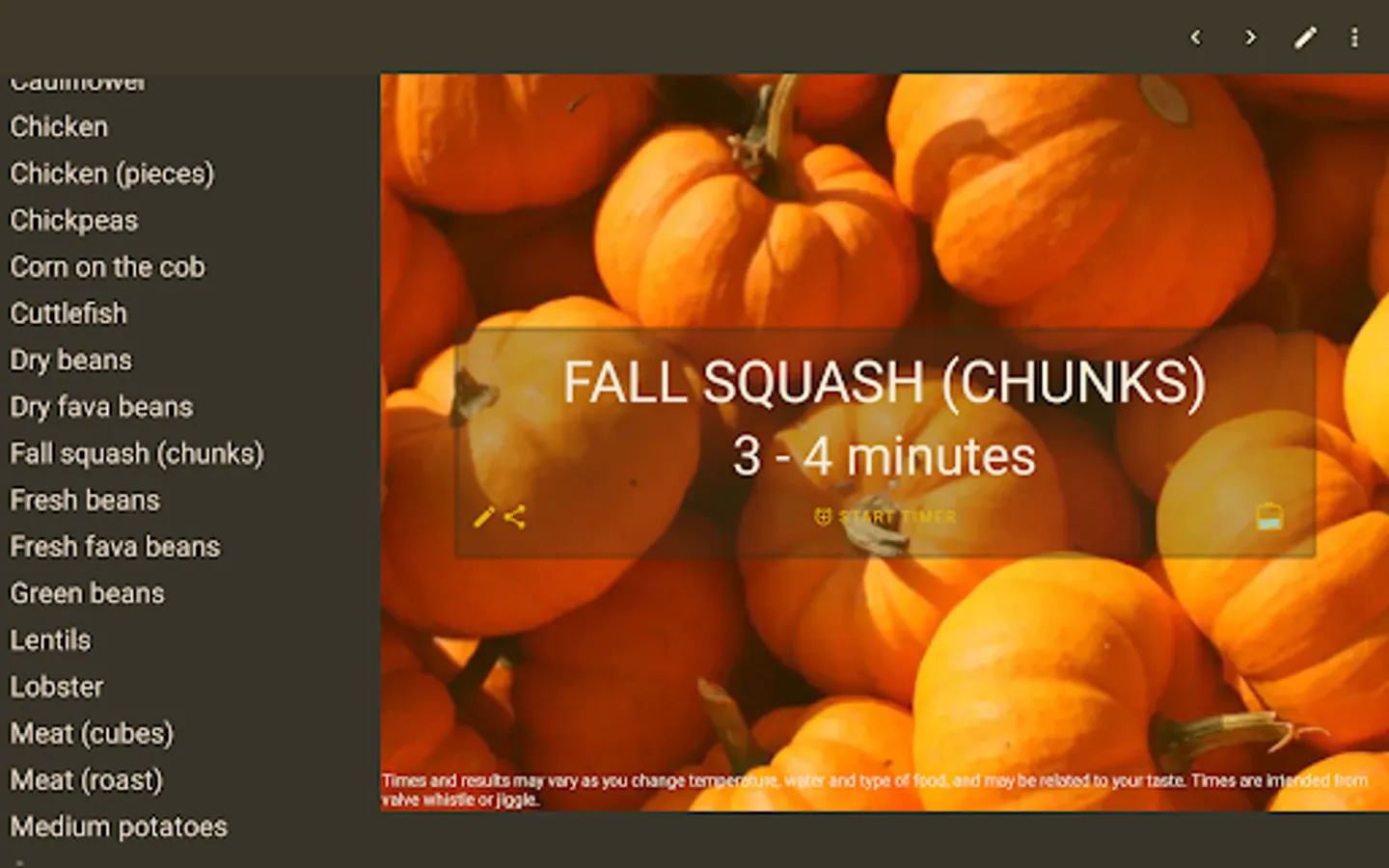 A wonderful app reporting the suggested timing to cook food in pressure cookers. It suggests minimum and maximum times and allow to easily set timers. As the results may vary with food type, taste, culinary traditions or even by the altitude of the place where you live, you can easily update the suggested times.
