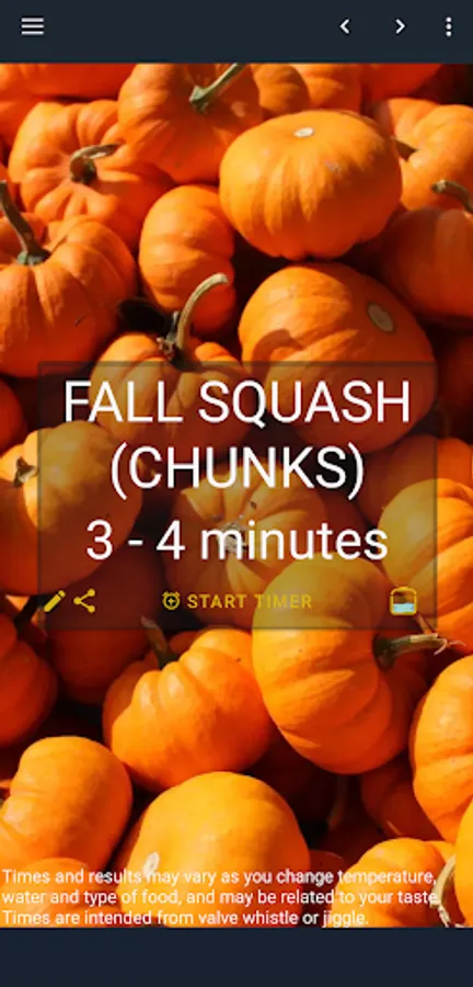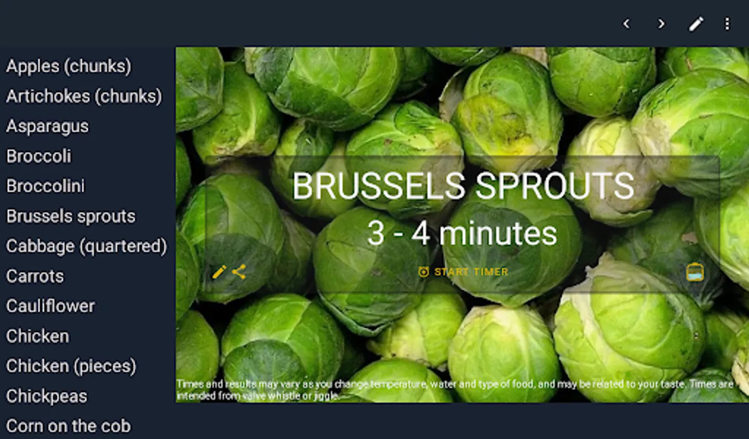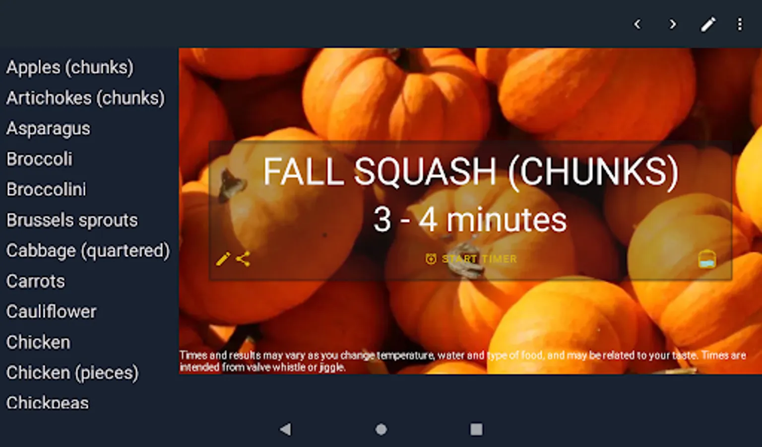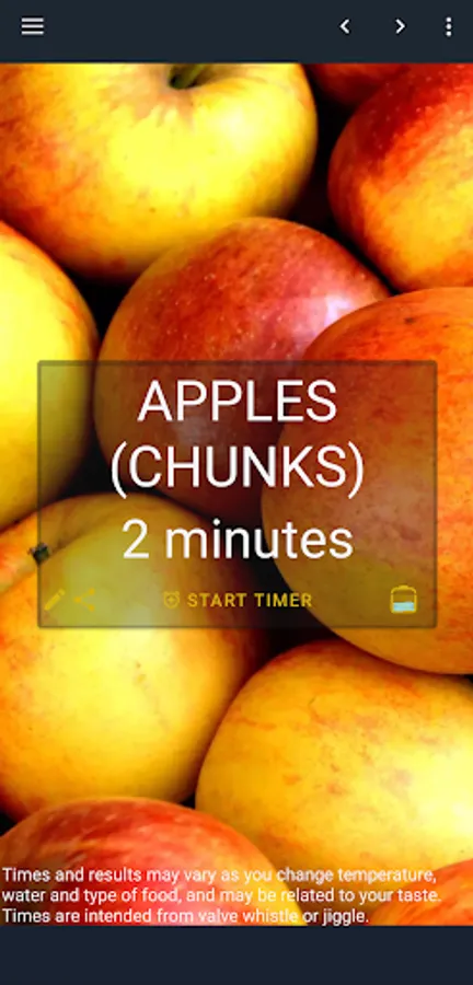A wonderful app reporting the suggested timing to cook food in pressure cookers. It suggests minimum and maximum times and allow to easily set timers. As the results may vary with food type, taste, culinary traditions or even by the altitude of the place where you live, you can easily update the suggested times.