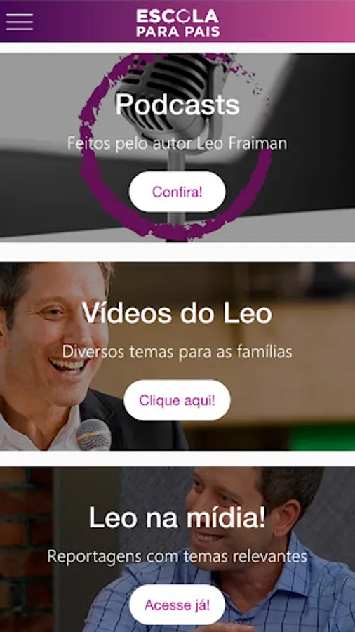 The EscolaParaPais app is a source of information and reference approved by professor and psychotherapist Leo Fraiman. It is an important tool for those who educate, as it addresses aspects of the physical and emotional development of children and adolescents, solving doubts, conflicts and promoting more assertive attitudes in the family environment.