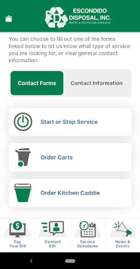 - Contact EDI directly through the app by phone or text. You may start or stop service, order carts and kitchen caddies, schedule bulky item pick-ups, and much more!