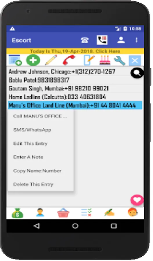 a) ESSENTIAL CONTACTS : These are your most important Contacts and are listed on the Main Screen. You can Import an Entry From Your Phone Contacts or Add One Manually. There is a Facility of Adding Notes/Activities for an Essential Contact. Birthday Reminders will be Flashed When ESCORT Starts.