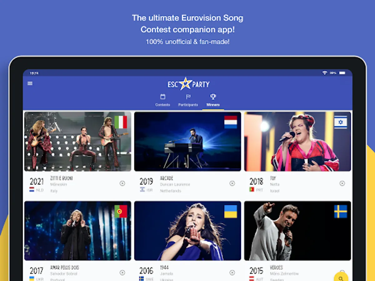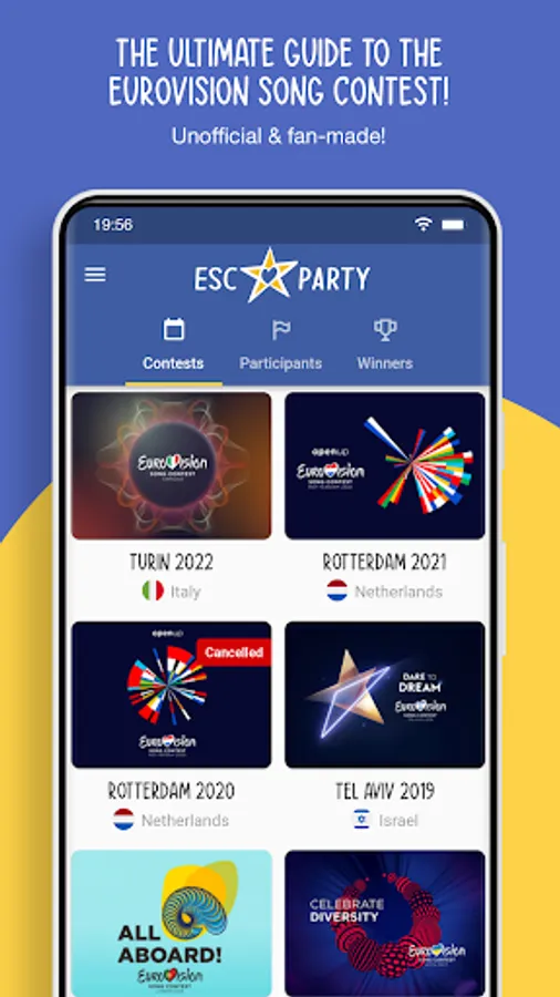 ESC Party is a guide to the Eurovision Song Contest from 1956 to 2023. This is an unofficial fan-made app allowing you to explore Eurovision like never before. Features include: