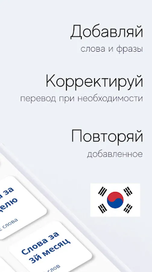 During training, you listen to the Korean word. At the same time, you remember not only its meaning, but also phonetic features. Next time it will be much easier to remember a word or phrase with a competent pronunciation.