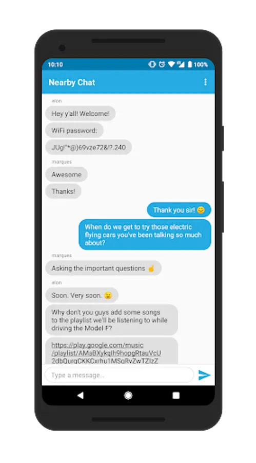 Open source experimental app demonstrating the use of Nearby Messages API for communicating between devices within close proximity of each other (within about 100 feet). The devices don't have to be on the same network, but they do have to be connected to the Internet.