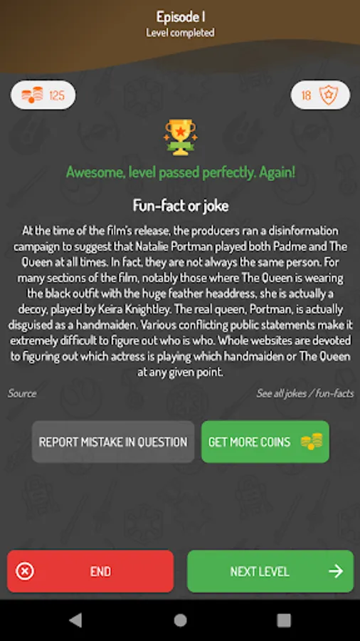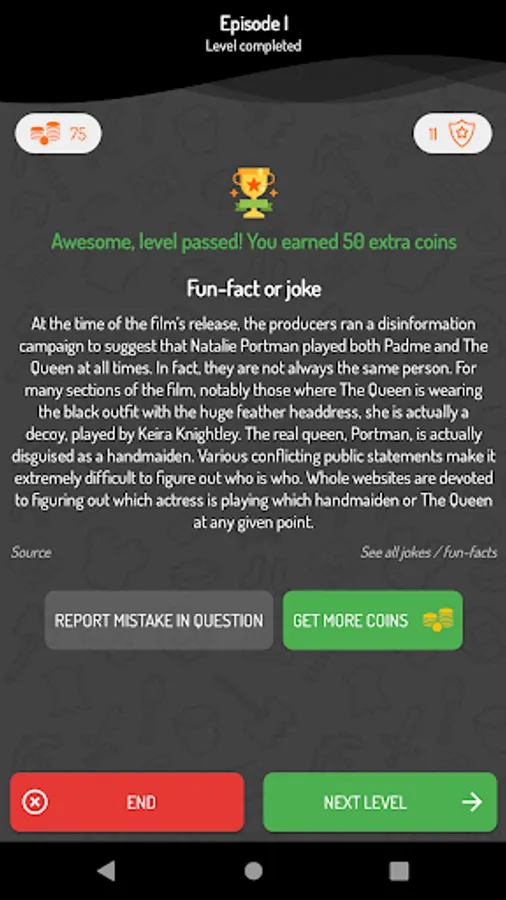 Playing this Quiz, you can also learn new things about your favorite game. Why? Because after every level, you can win courius fact about your favorite movie or joke or... meme! Yes, you can win memes, specially selected by us - for you 😊.
