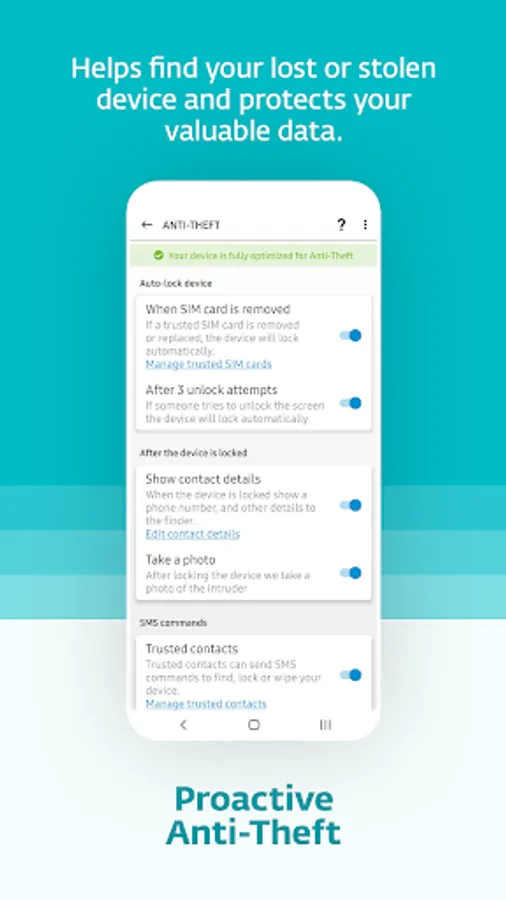 ✓ Proactive Anti-Theft – powerful features to help protect your phone, and find it if it goes missing: