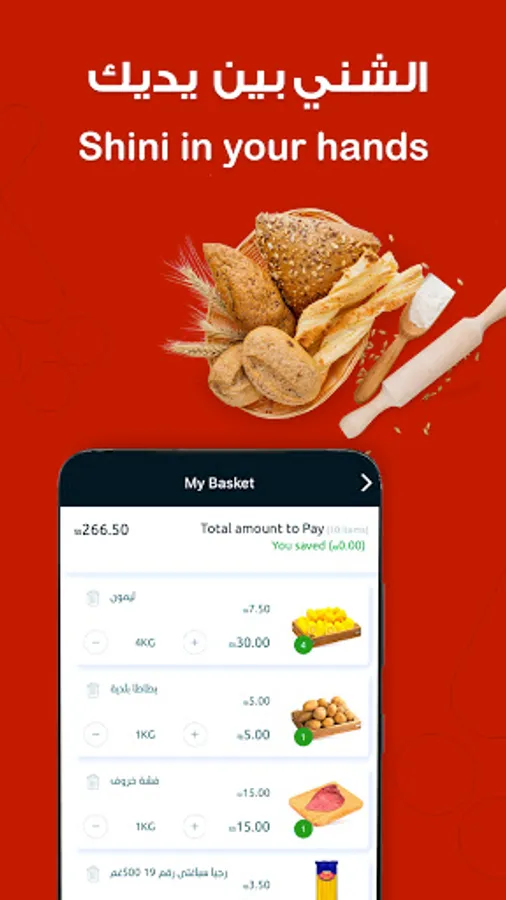 Shini Markets branches and eShini App contain several sections such as: the vegetables and fresh fruits section, meat and poultry, in addition to milk and eggs, the ice cream section, canned foods, juices, household items, cleaning, and a special section for child and mother care, the roastery. Also, the branches contain a bakery that provide a wide variety of fresh eastern and western bakeries and sweets.