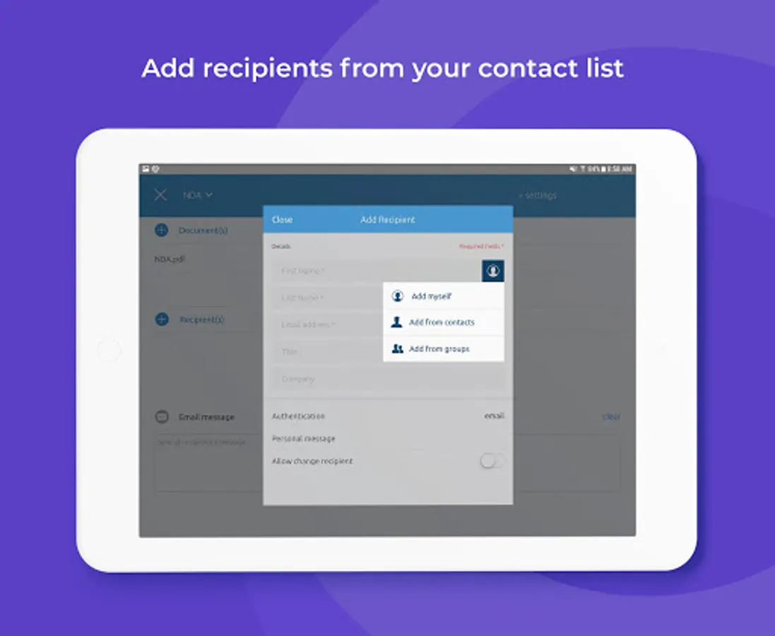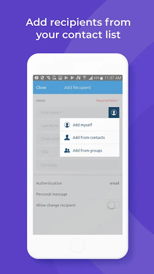 • Validate your signers’ identity using a variety of authentication methods directly in the app, including email, Q&A, and SMS text code