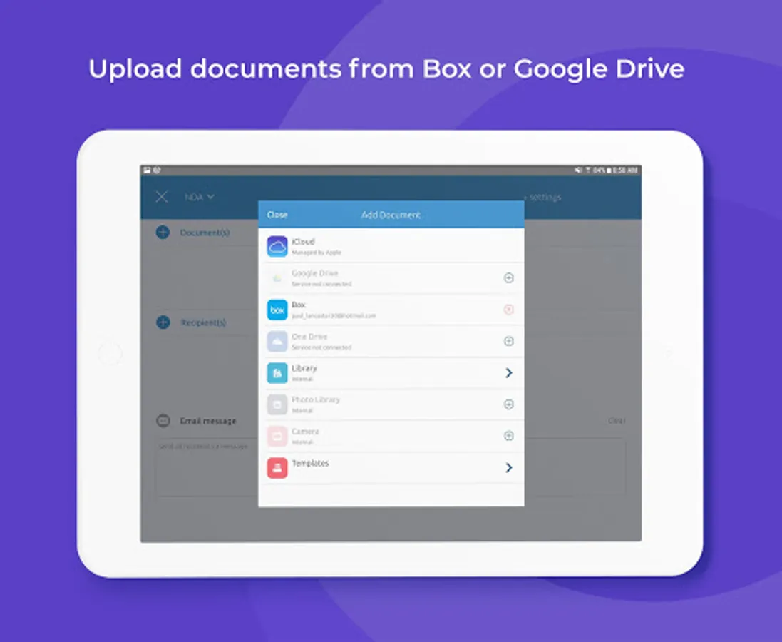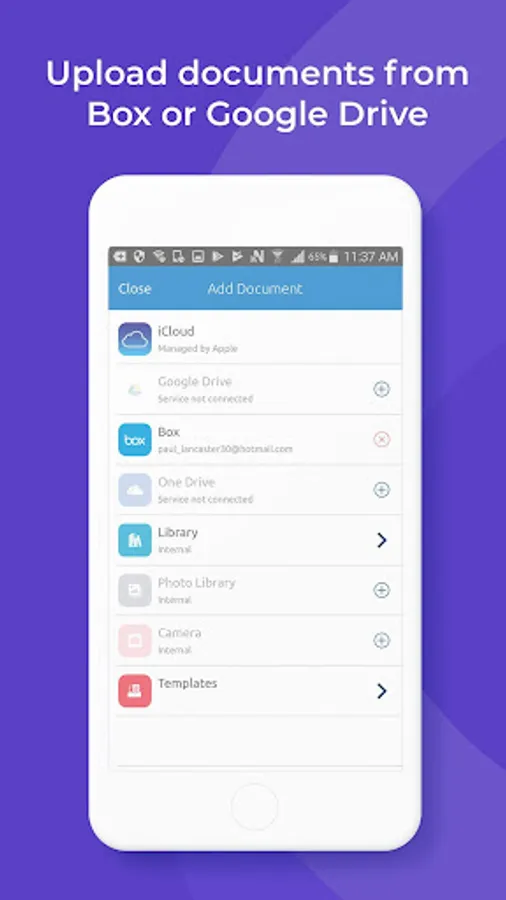 • Upload documents from cloud storage services such as Google Drive, Dropbox, Box, OneDrive and more