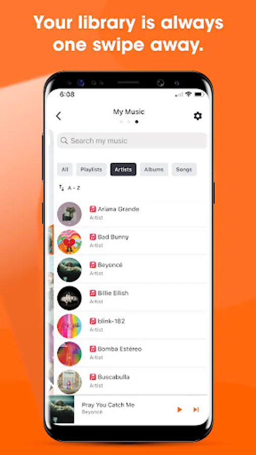 Stay grounded as you swipe between three views: search, the queue, and your music library. Gone are the days of closing stacks of screens to see what plays next. Or adding songs to a queue that you can’t see. With Giddy, you are always just one swipe away.
