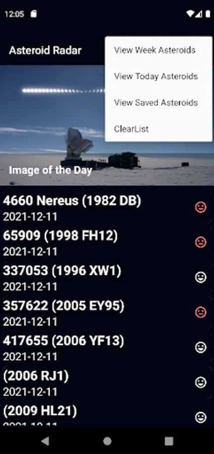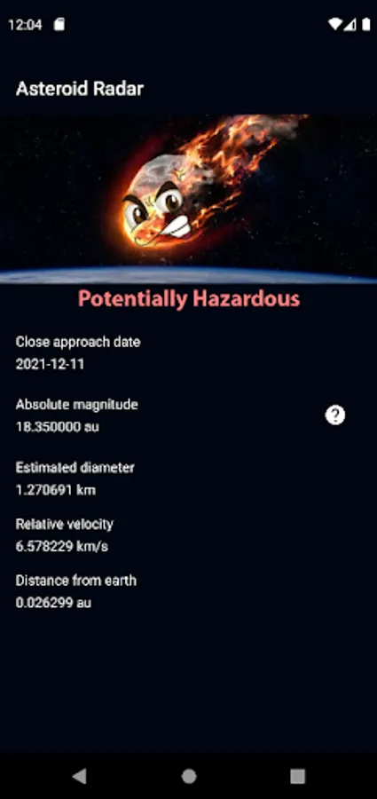 -Asteroid Radar utilizes NASA NeoWs (Near Earth Object Web Service) for near earth Asteroid information, The App upon opening will fetch the asteroids data for entire week starting from the current user date and cache them.Asteroids will be listed by its names and ordered by date, the user can click any of them to get to a details screen contains selected asteroid info like if it is hazardous or not ,velocity,distance from earth,etc....