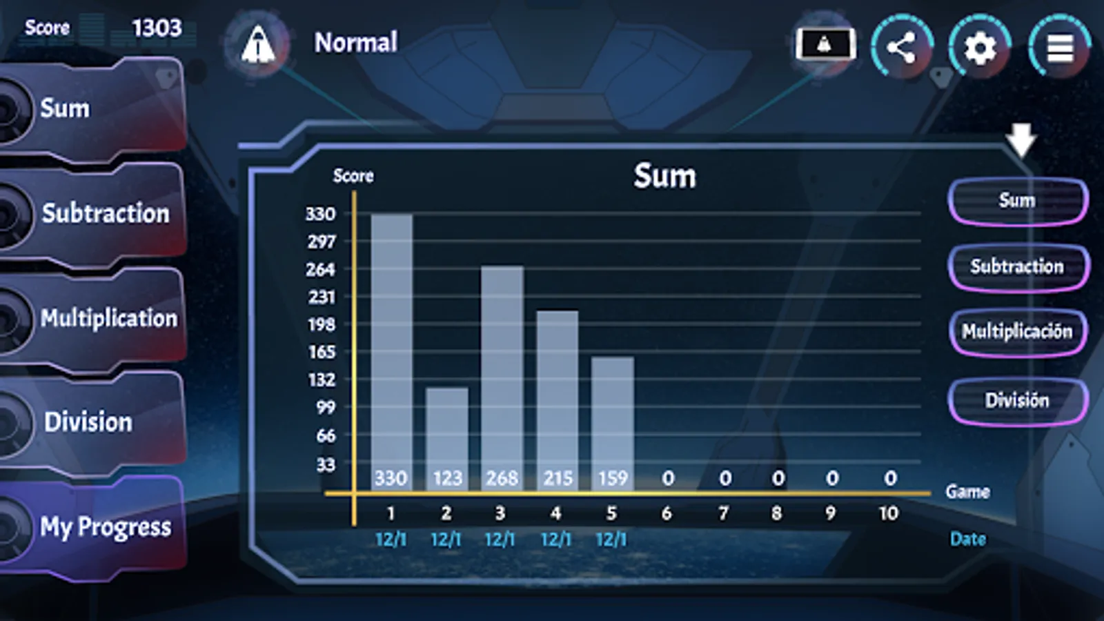 Practice addition, subtraction, multiplication and division exercises. Destroy with your spaceship the blocks that have the result of the exercises that are shown to you.